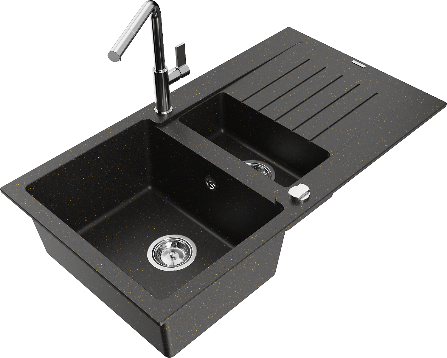 Mexen Matias 1,5 kamrás gránit mosogató csepegtetővel és Flora konyhai csapteleppel, fekete/arany metál - 6502-75-670401-00