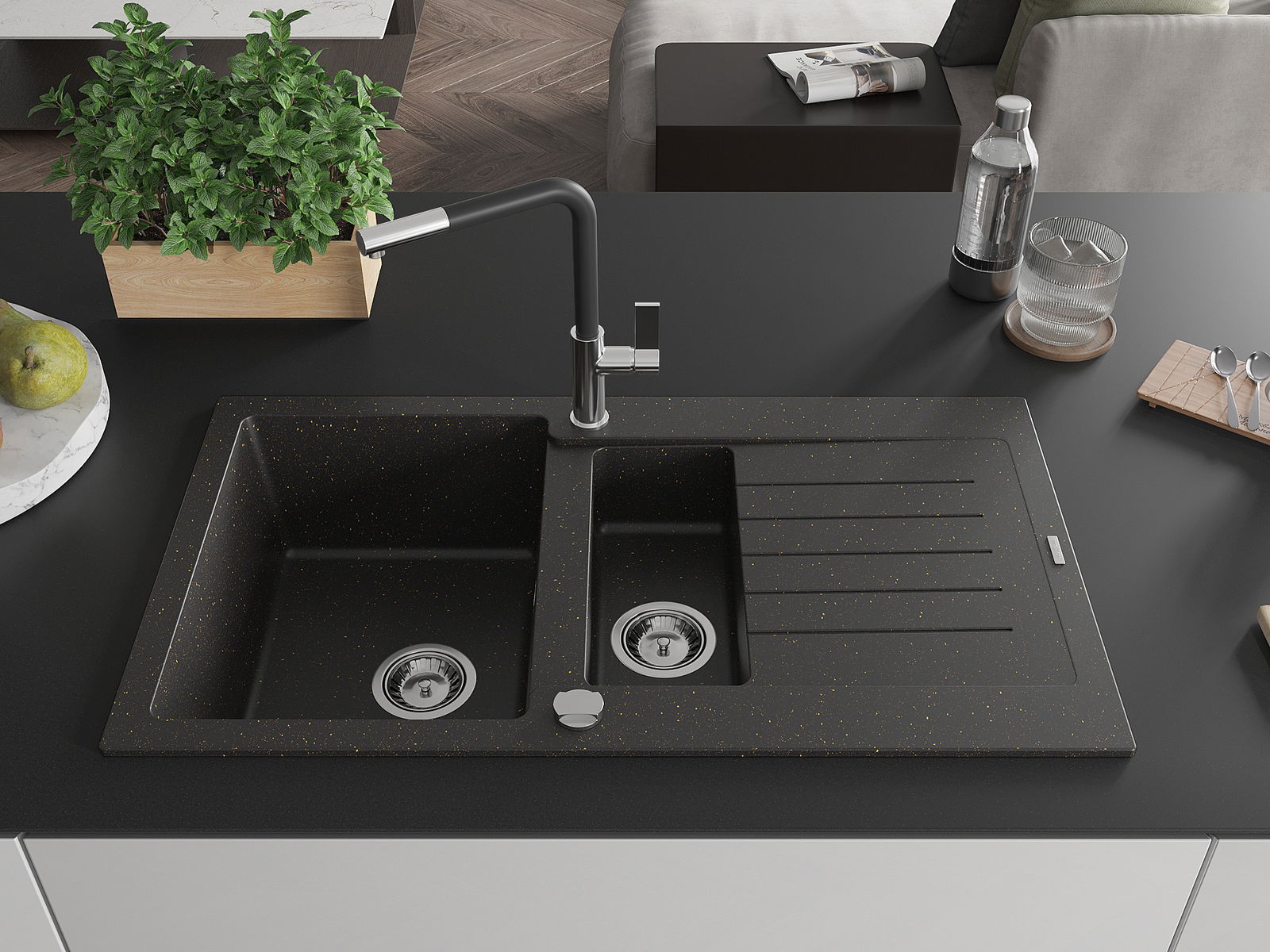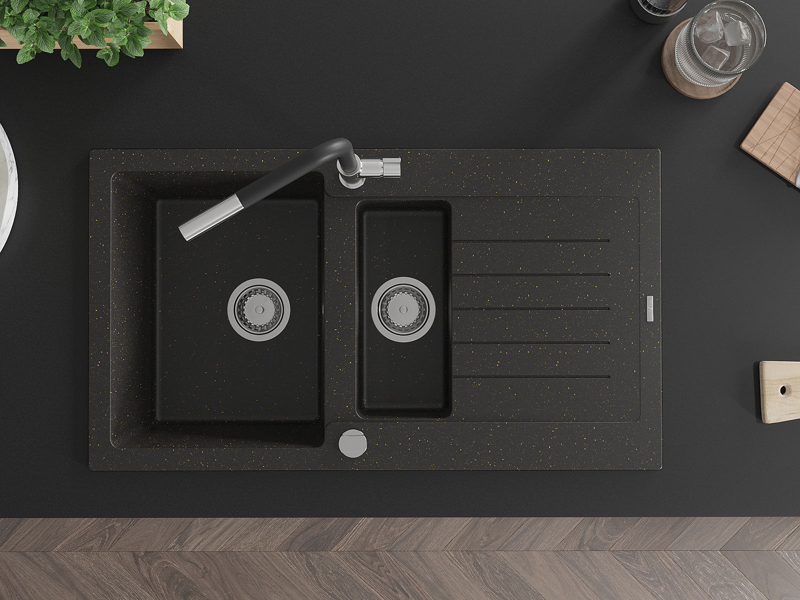 Mexen Matias gránit mosogatótálca 1,5-medencés csepegtetővel és Flora konyhai csapteleppel, fekete/arany metál - 6502-75-670401?