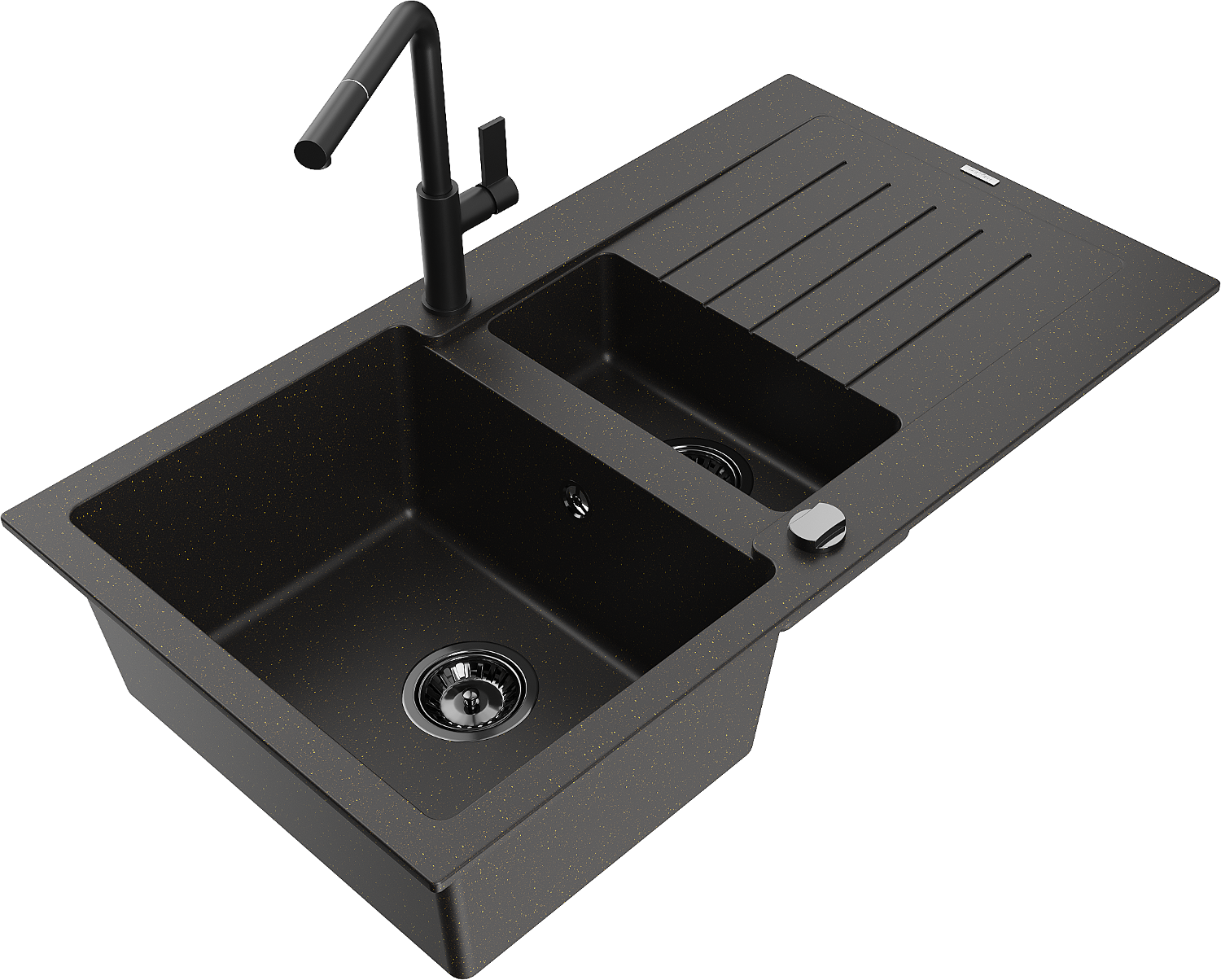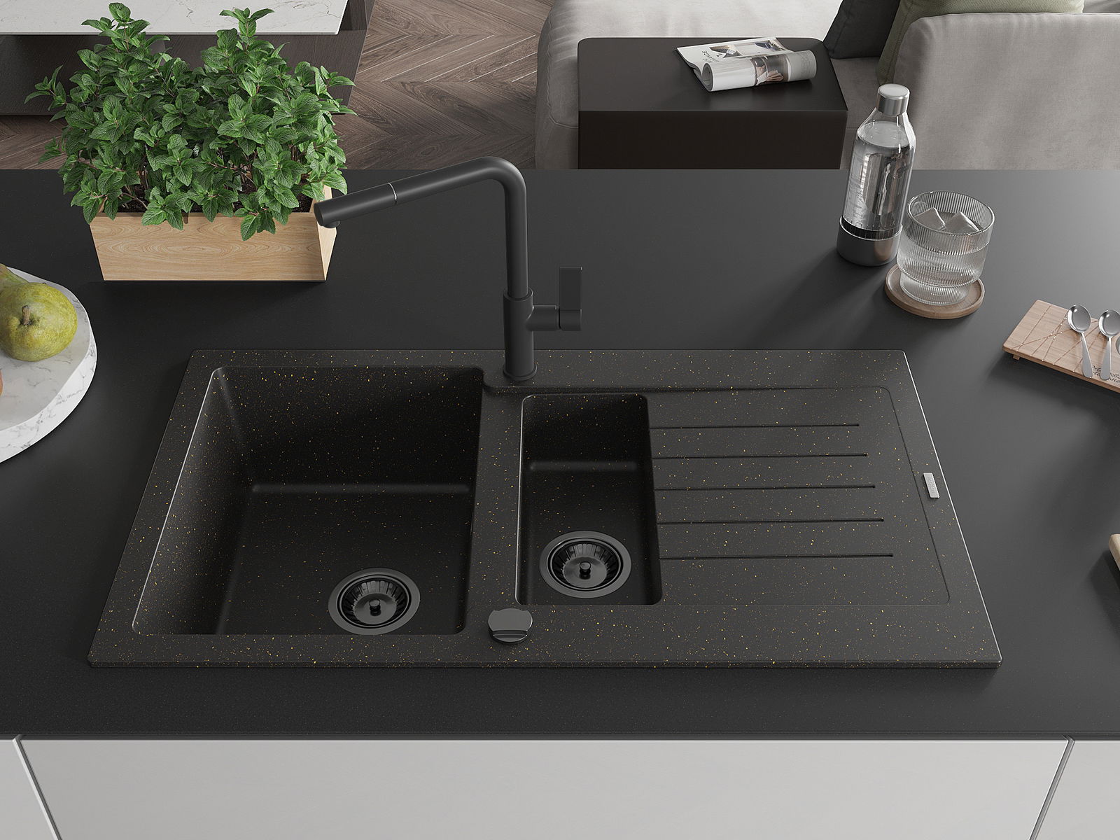 Mexen Matias gránit mosogató 1,5 rekeszes csöpögtetővel és Flora konyhai csappal, fekete/arany - 6502-75-670401-70-B