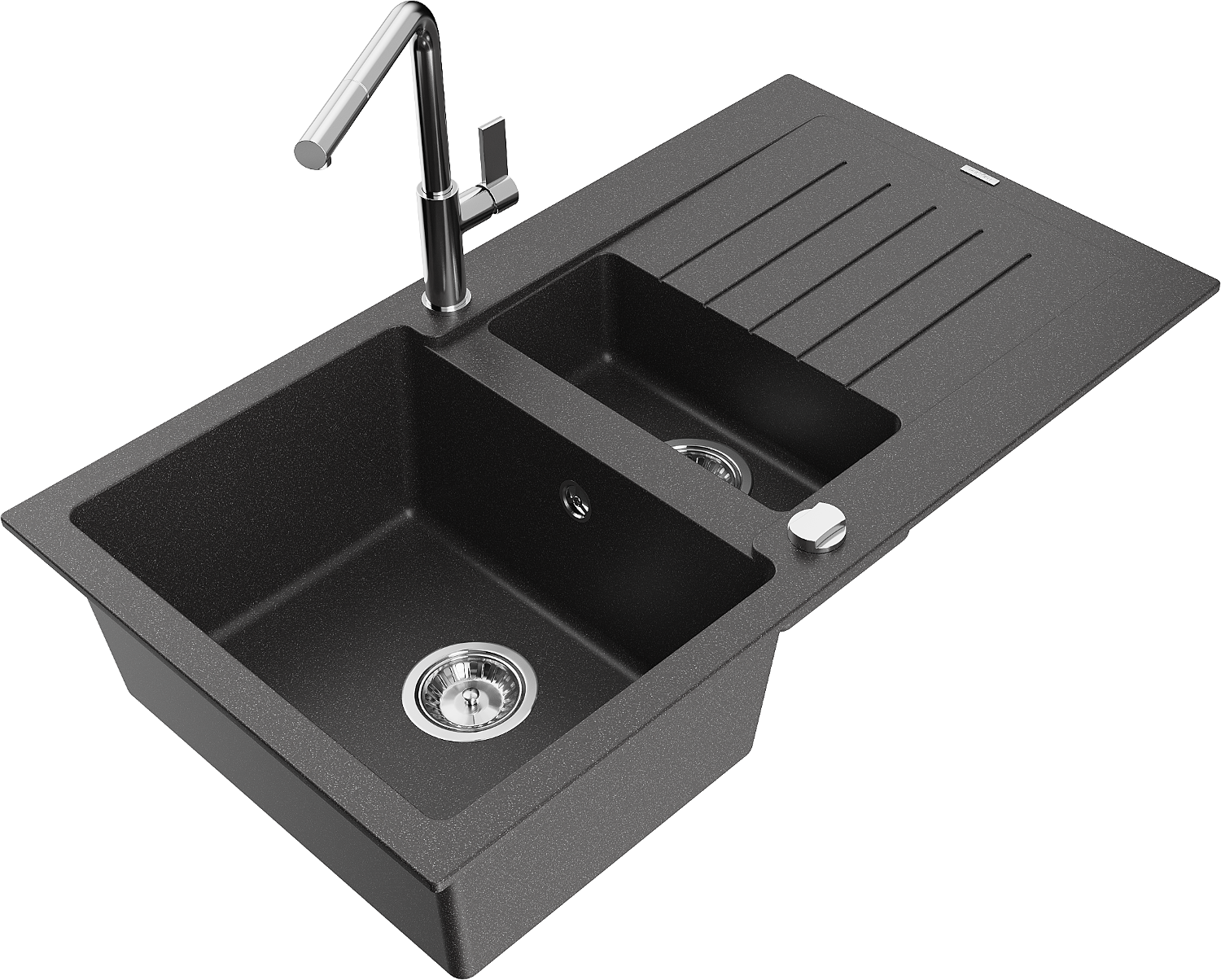 Mexen Matias 1,5-medencés gránit mosogató csepegtetővel és Flora konyhai csapteleppel, fekete foltos - 6502-76-670401-00