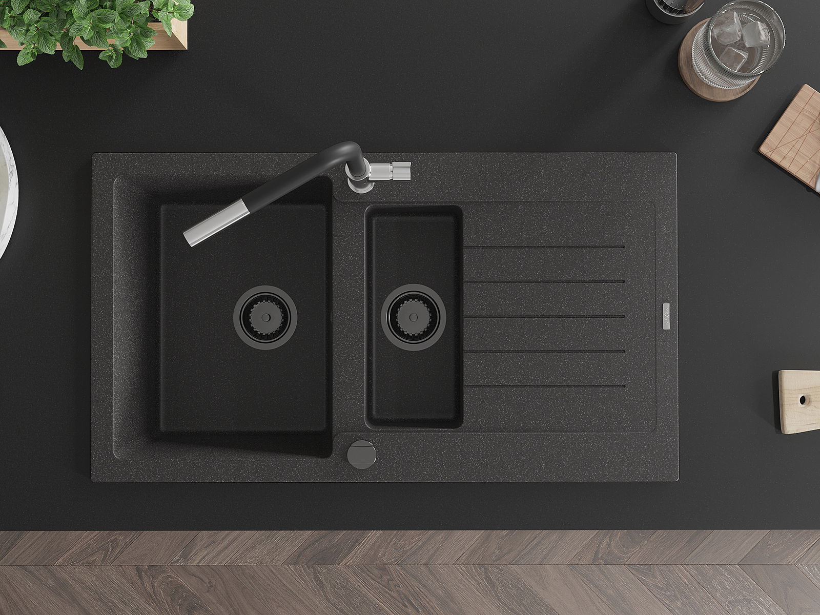 A mosogató kiváló minőségű gránitból készül. Ez egy elegáns és mindenekelőtt minden konyhához praktikus kiegészítés, stílusától függetlenül. A kiváló minőségű és a gránit tartósság biztosítja a sok éves használatát.
