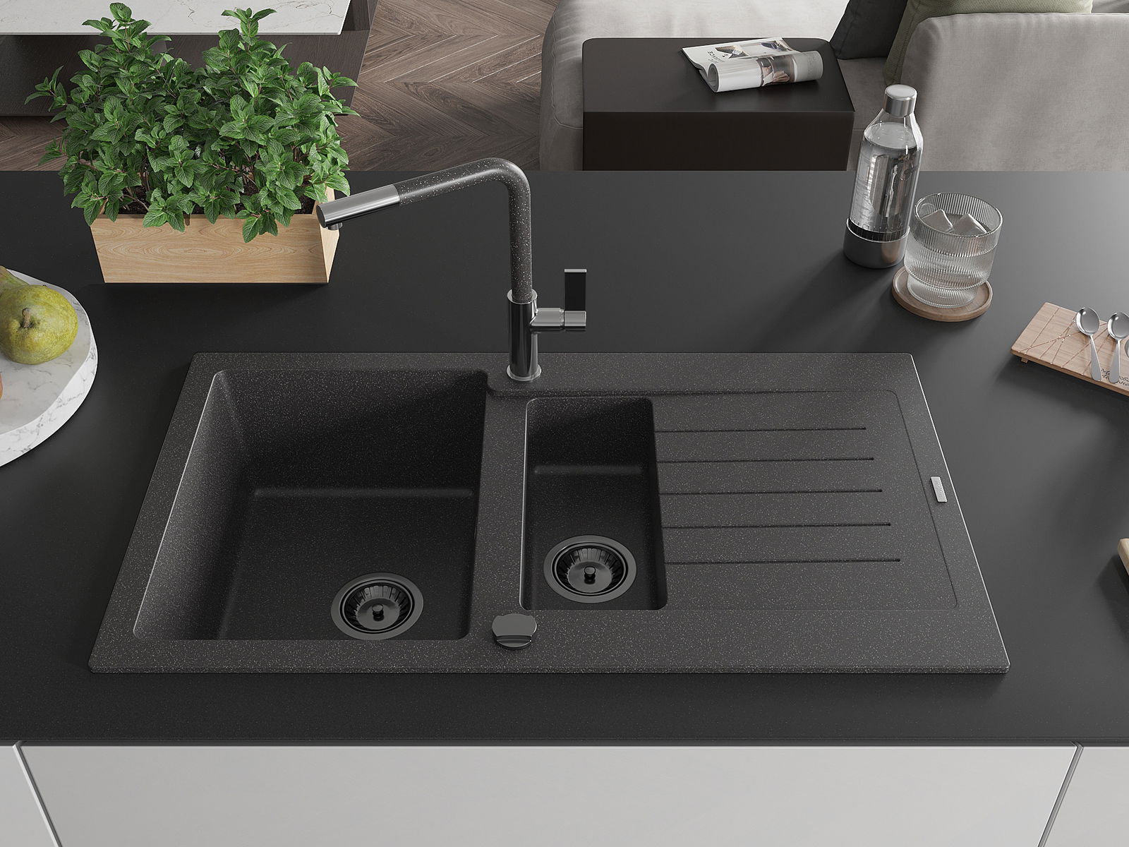 Mexen Matias félkomoly gránit mosogató csepegtetővel és Flora konyhai csappal, fekete pöttyös - 6502-76-670401-08-B