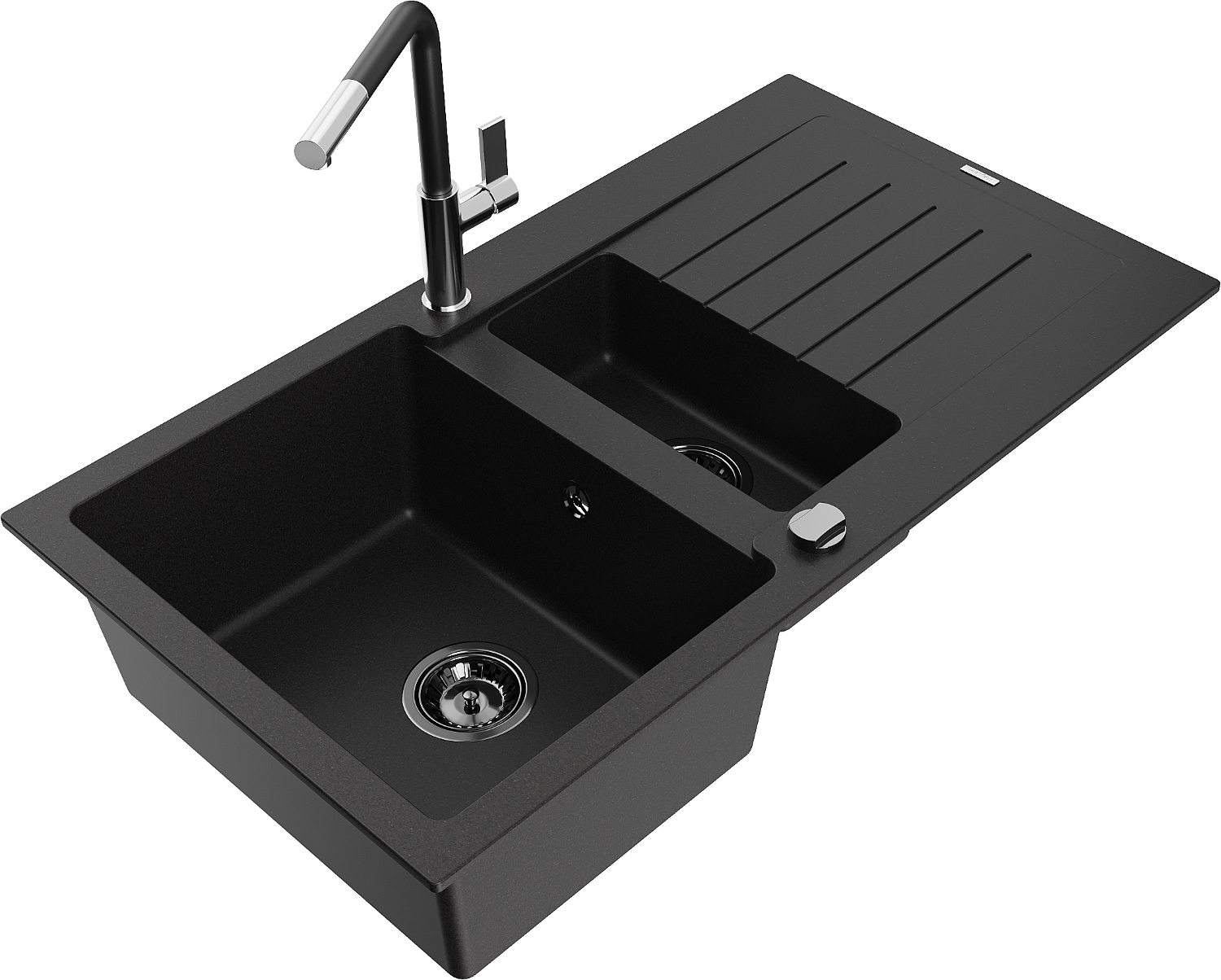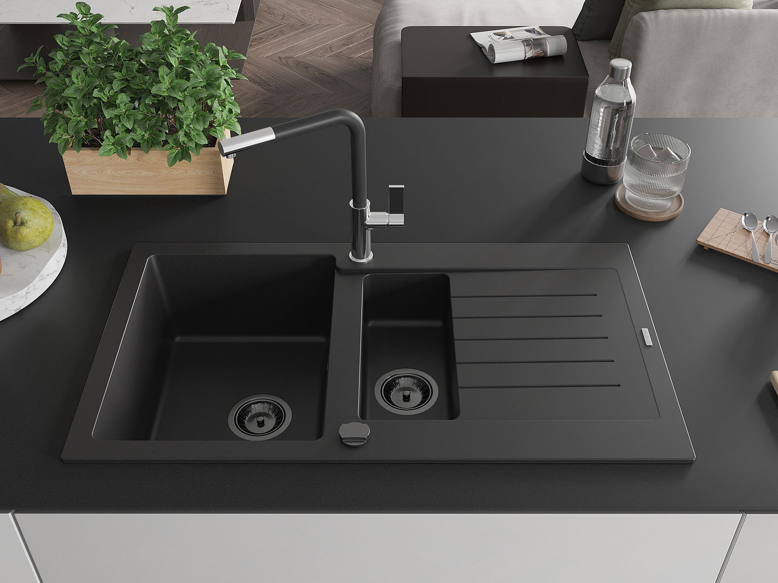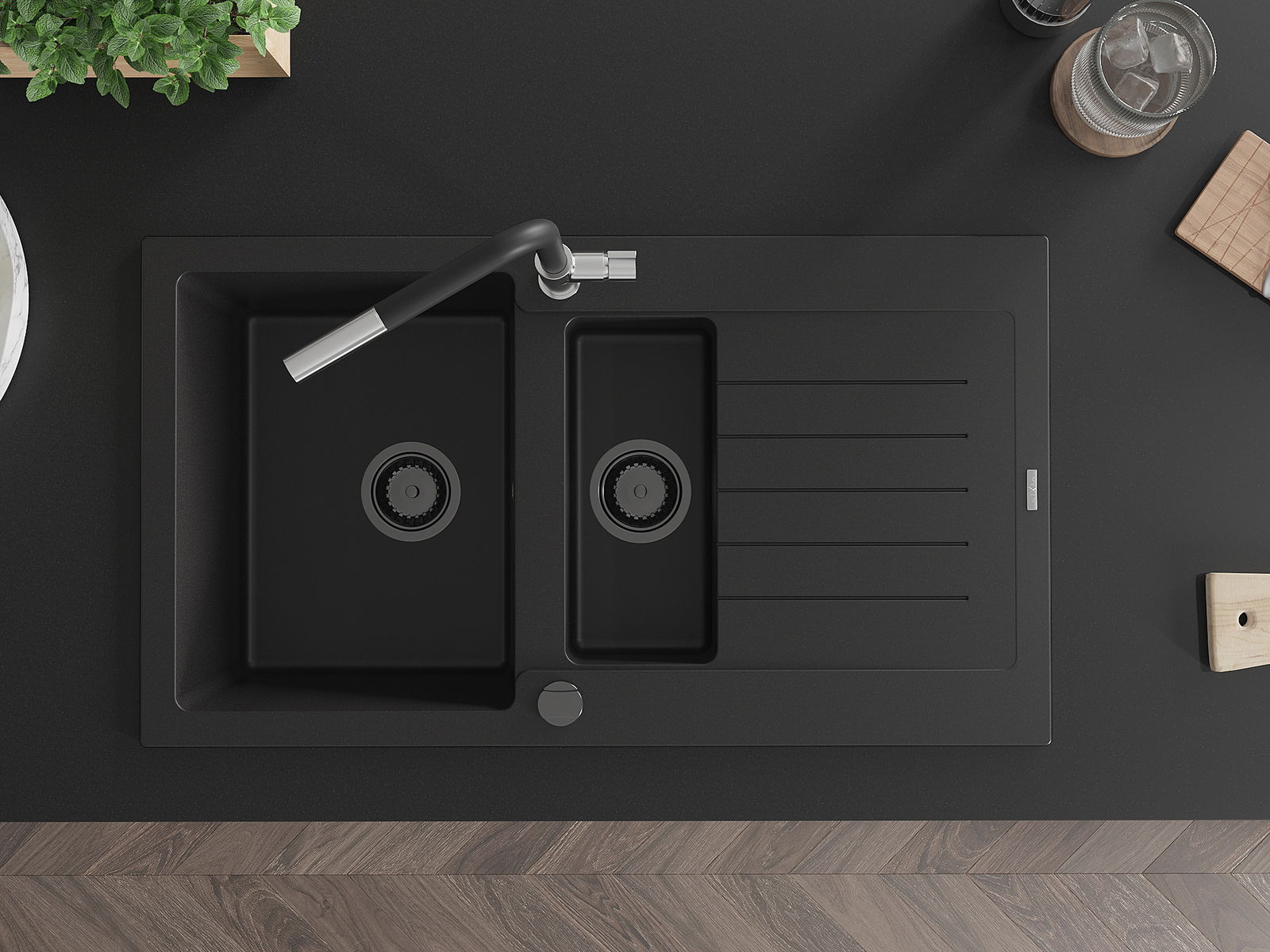 Mexen Matias gránit mosogató 1,5-medencés csepegtetővel és Flora konyhai csapteleppel, fekete - 6502-77-670401-07-B