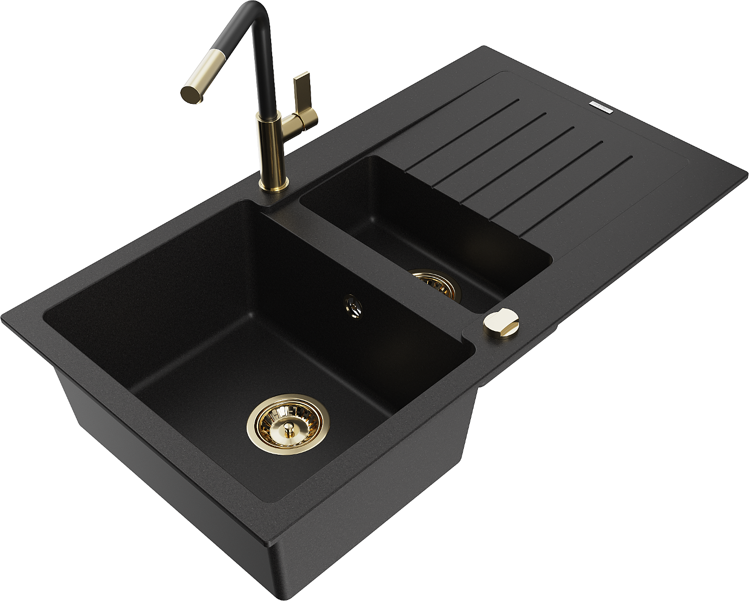 Mexen Matias 1,5 kamrás gránit mosogató lefolyóval és Flora konyhai csapteleppel, fekete - 6502-77-670401-57-G