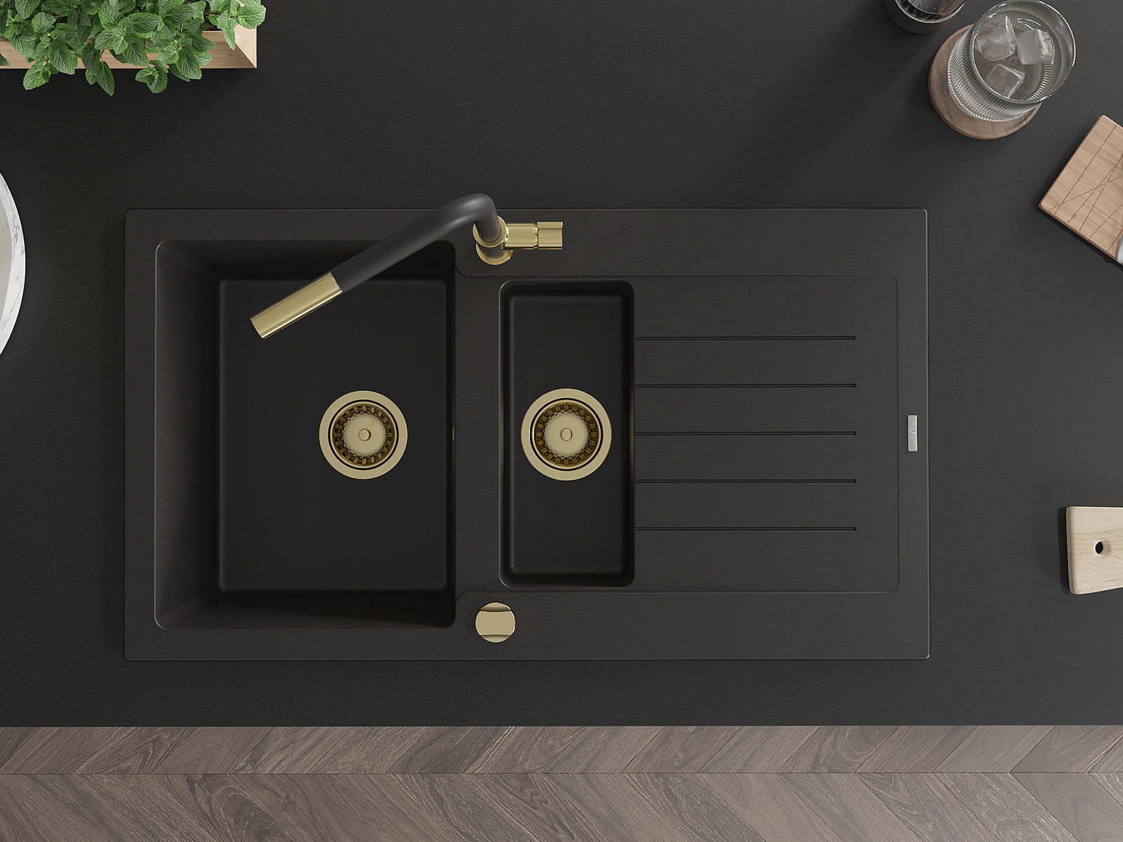 A mosogató 2 összekapcsolt lyukkal rendelkezik, amelynek átmérője 35 mm, önmagában. Felhasználhatók többek között Olyan folyékony adagoló rögzítéséhez, amely kiküszöböli a műanyag palackok jelenlétét a konyhában, és elegáns kivitelben adja meg.
