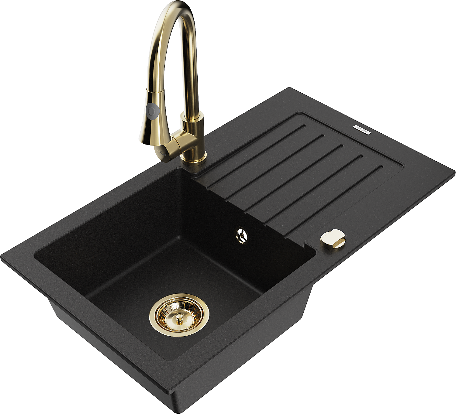 Mexen Pablo szürke kompozit mosogatótálca elvezetőcsatornával és Elia konyhai csapteleppel, fekete - 6510-77-670101-50