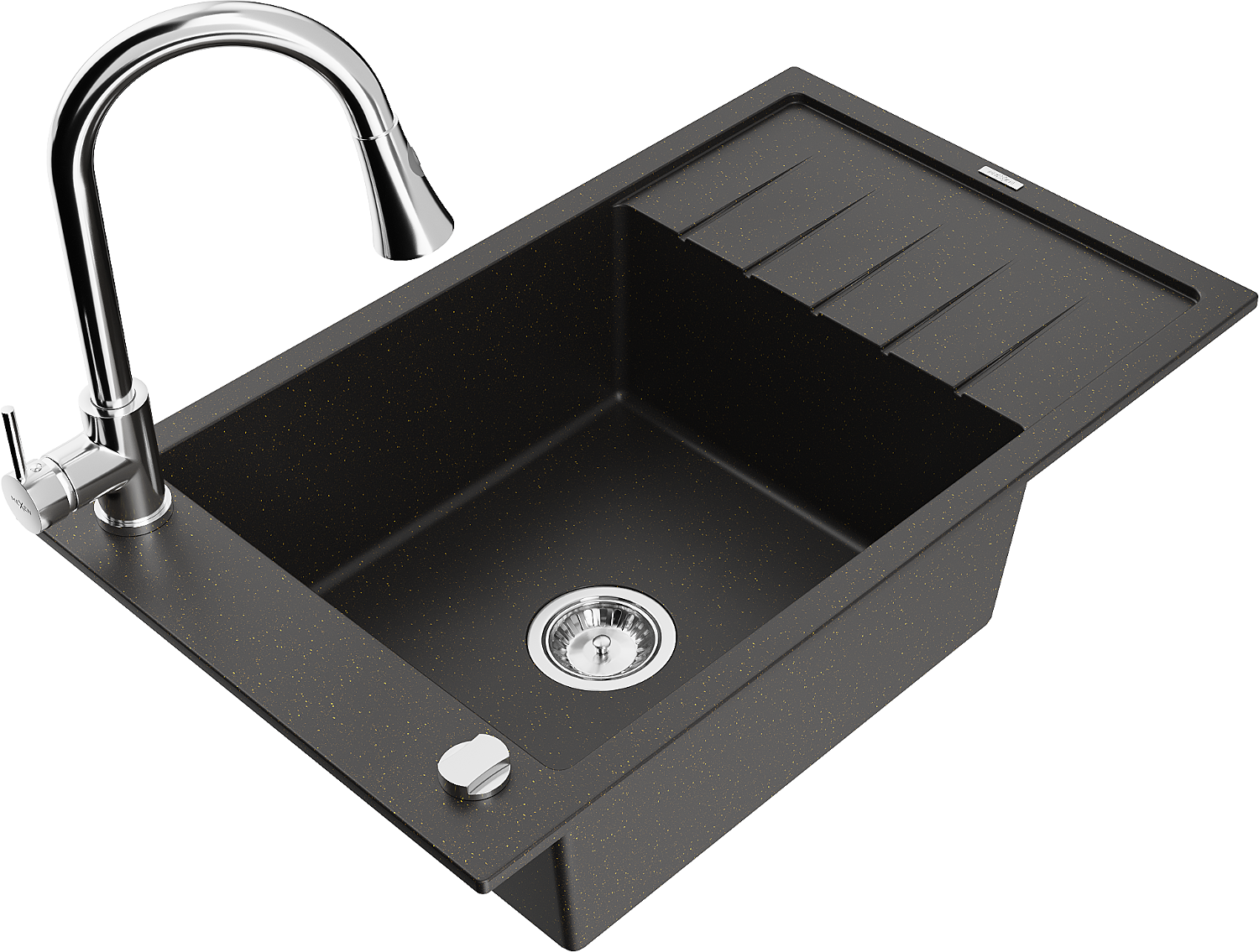 Mexen Elias 1 rekeszes gránit mosogató csepegtetővel és Elia konyhai csappal, fekete/arany metál - 6511-75-670101-00