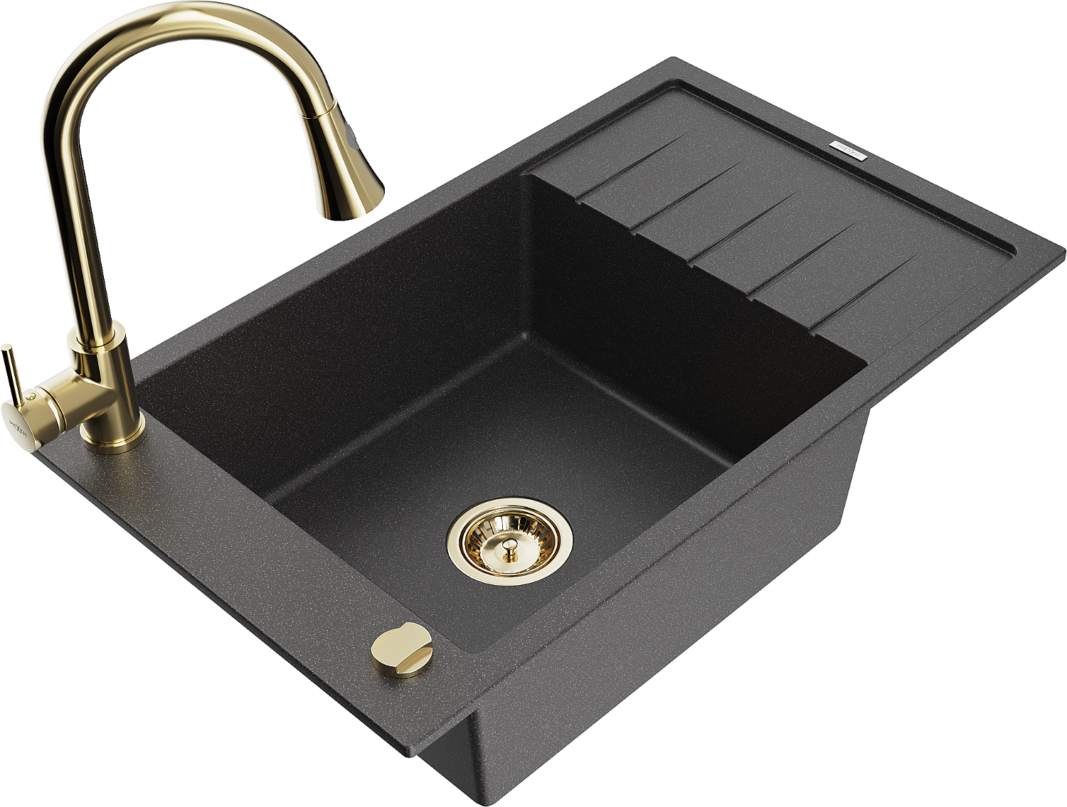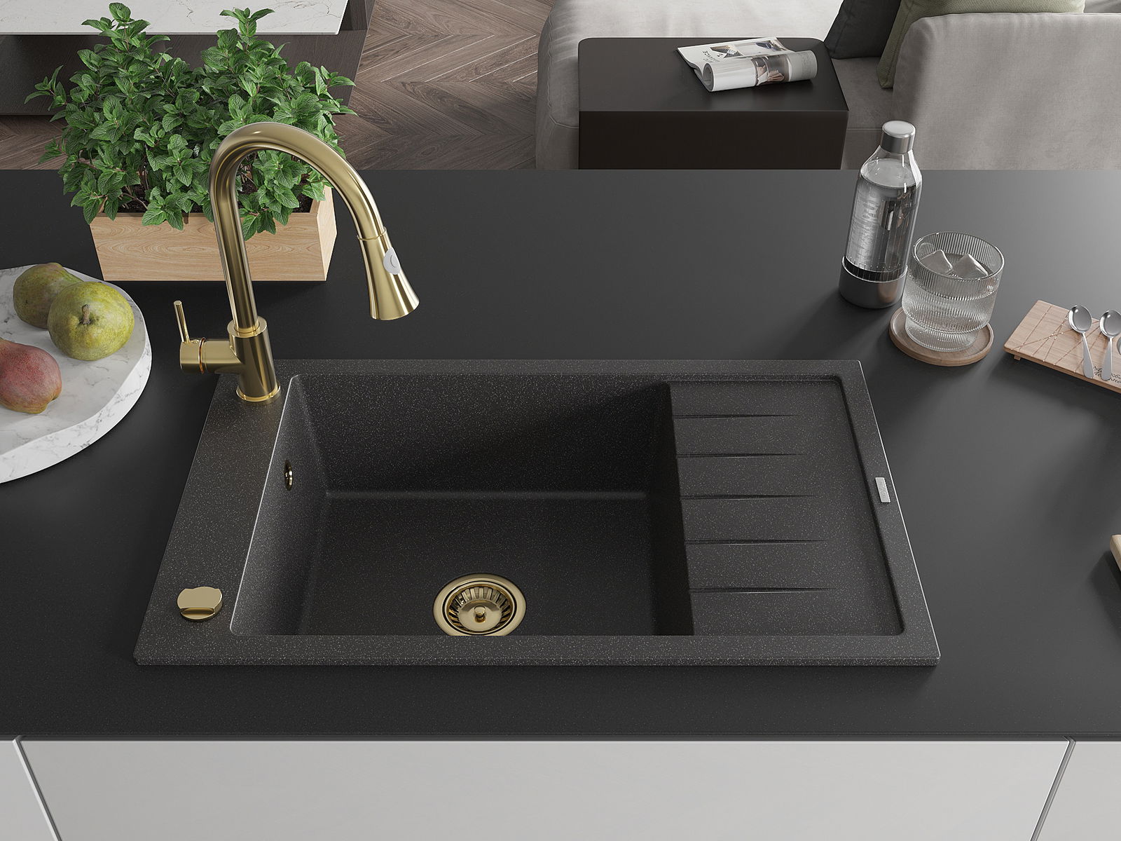 Mexen Elias 1 rekeszes gránit mosogató csepegtetővel és Elia konyhai csapteleppel, fekete pettyes - 6511-76-670101-50