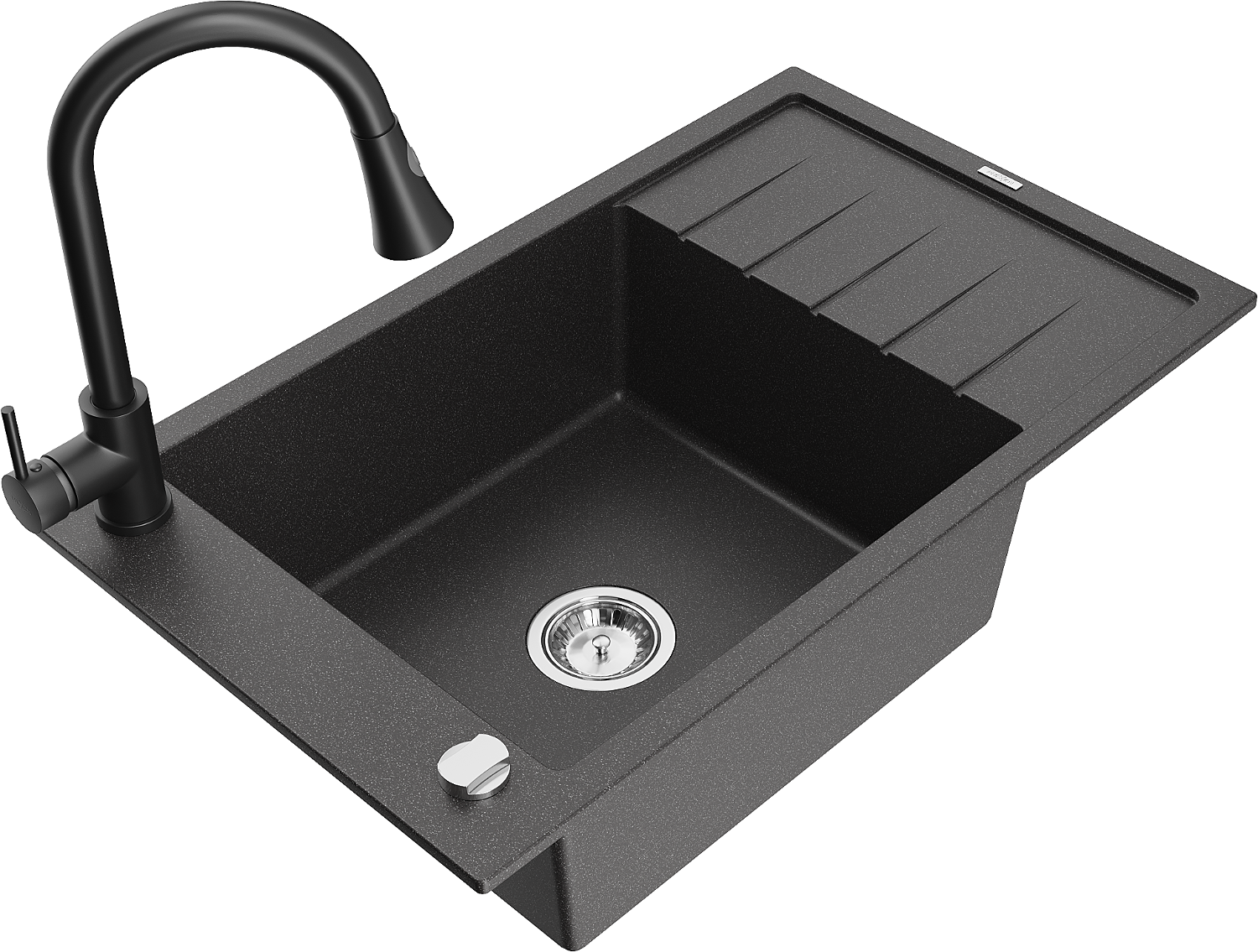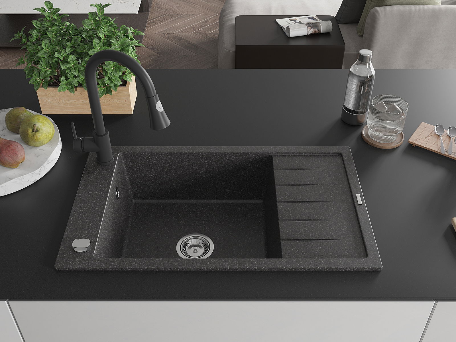 Mexen Elias gránit mosogató, 1-medencés, csepegtetővel és konyhai csappal Elia, fekete pöttyös - 6511-76-670101-70
