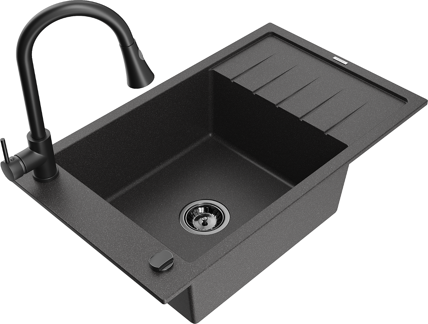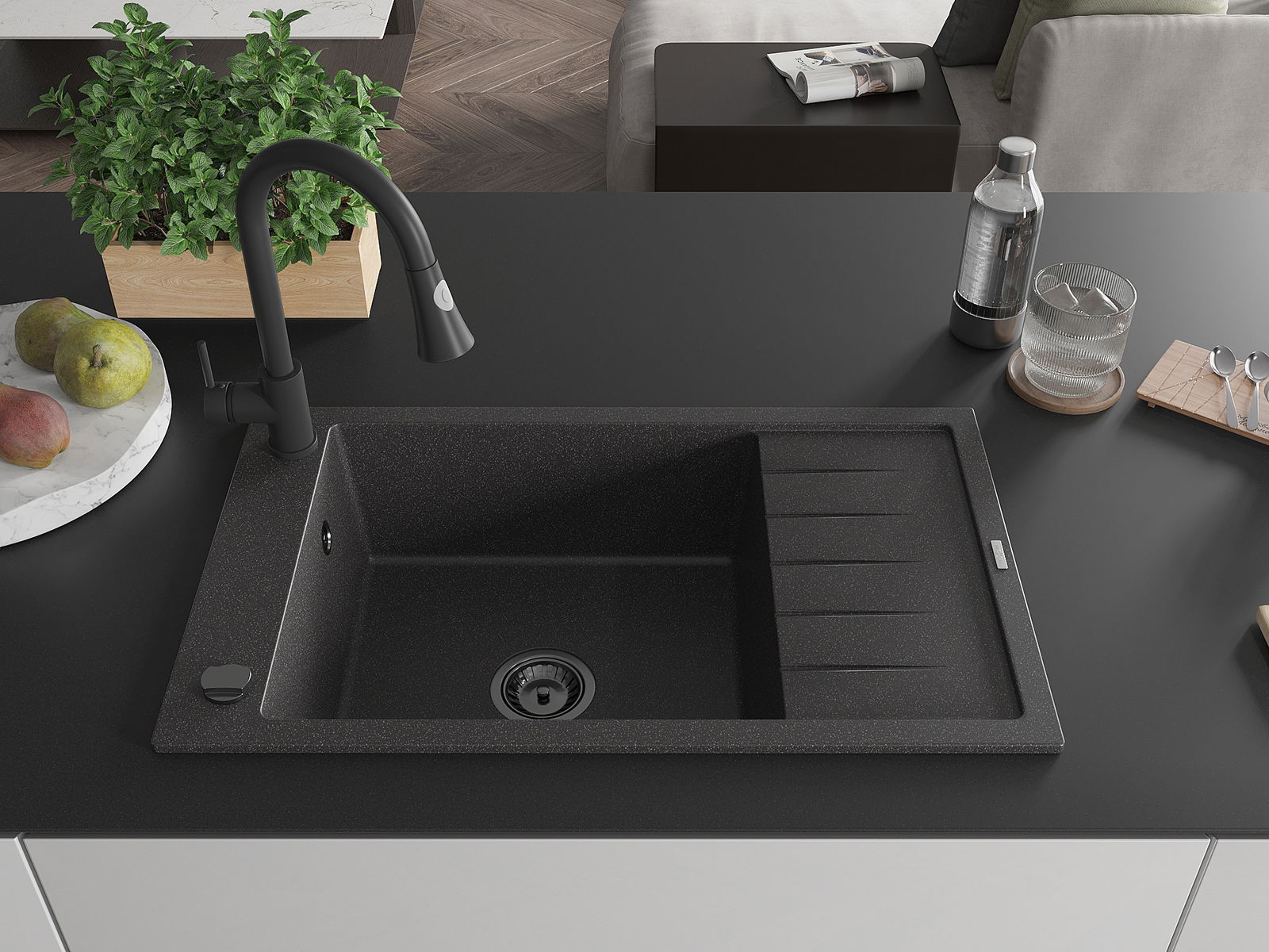 Mexen Elias egykamrás gránit mosogató csepegtetővel és Elia konyhai csappal, fekete spriccelt - 6511-76-670101-70-B