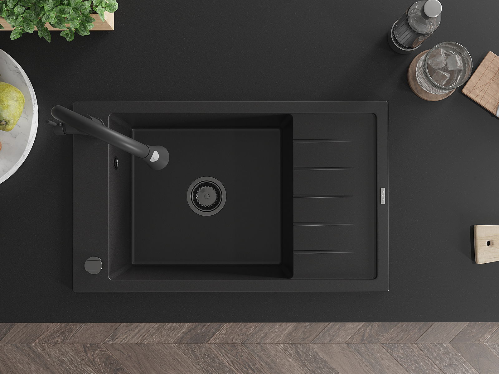 Mexen Elias 1-medencés gránit mosogató csepegtetővel és Elia konyhai csappal, fekete - 6511-77-670101-70-B