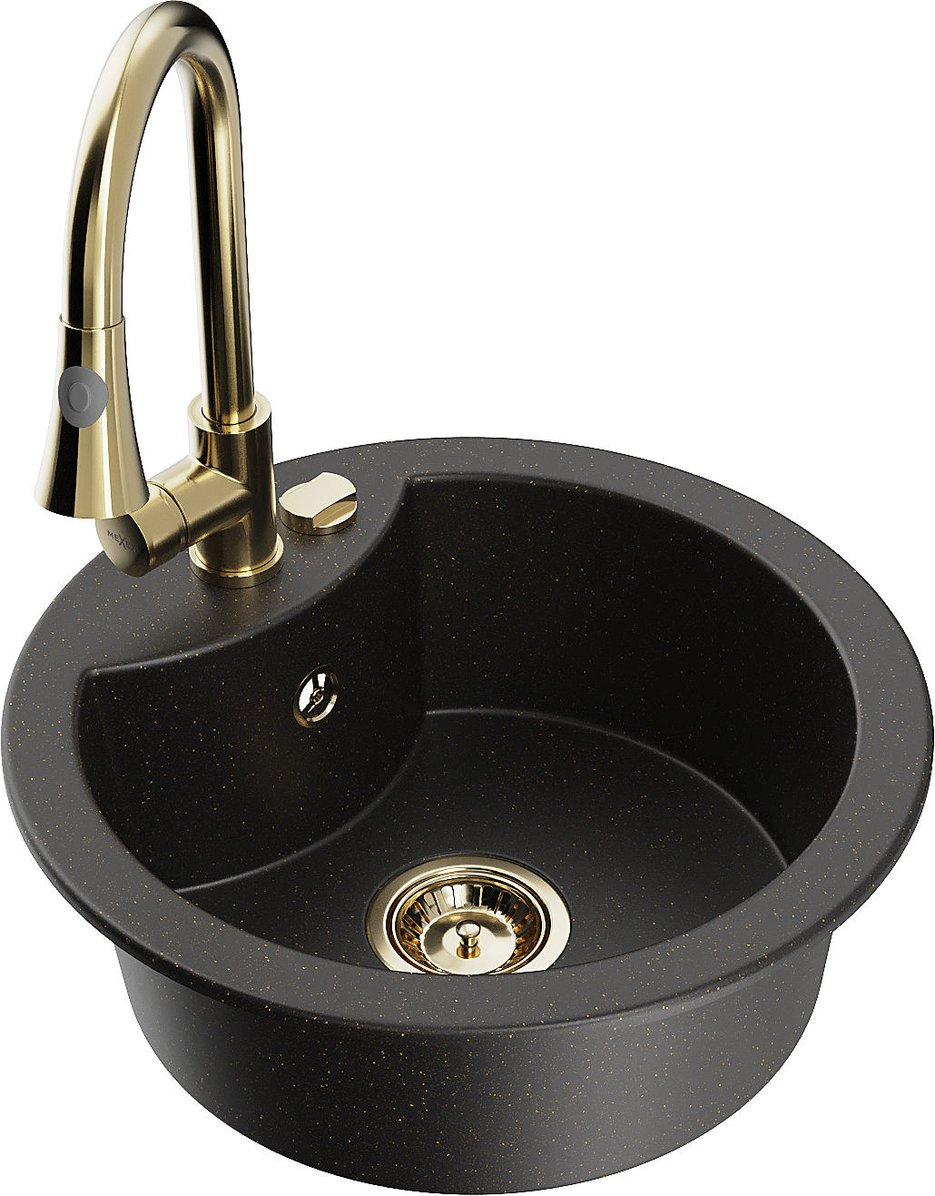 Mexen Diego egykamrás gránit mosogató Elia konyhai csappal, fekete/arany metál - 6512-75-670101-50