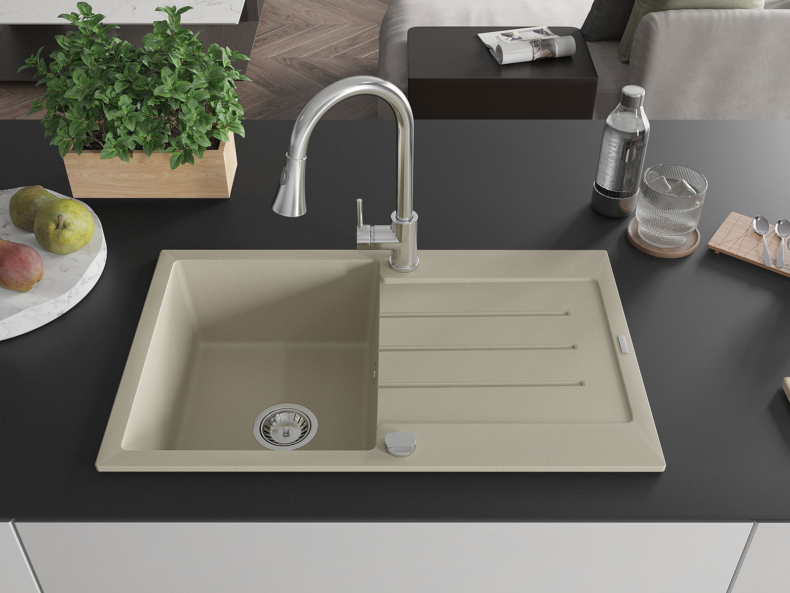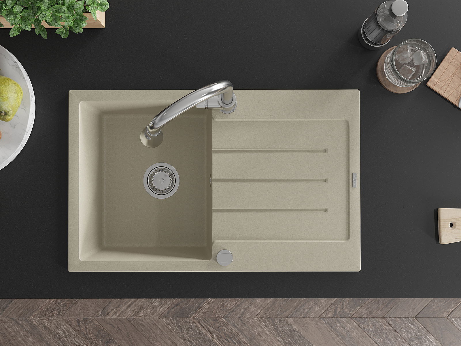 A mosogató kiváló minőségű gránitból készül. Ez egy elegáns és mindenekelőtt minden konyhához praktikus kiegészítés, stílusától függetlenül. A kiváló minőségű és a gránit tartósság biztosítja a sok éves használatát.