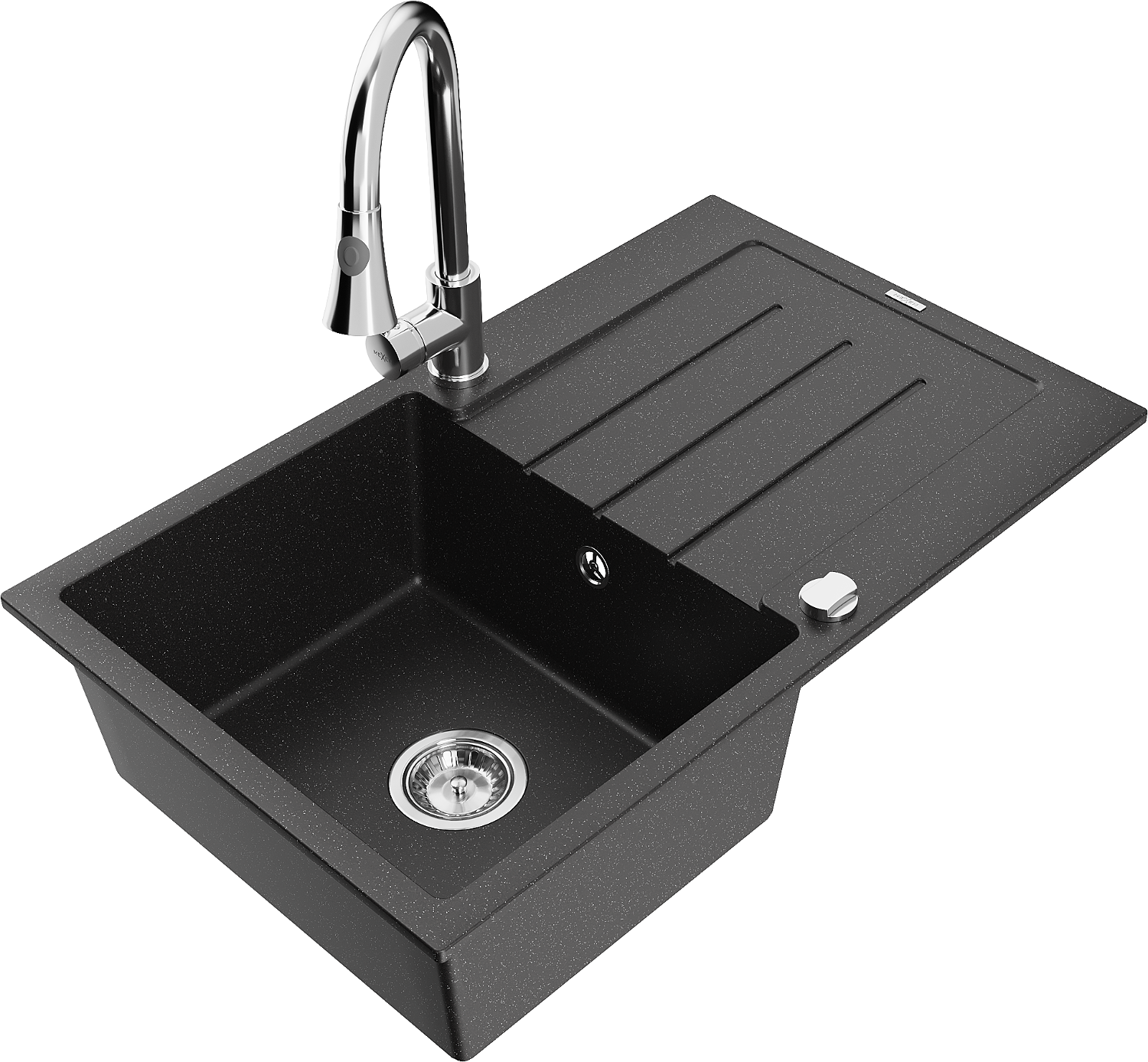 Mexen Bruno 1-komorás gránit mosogató csepegtetővel és Elia konyhai csappal, fekete/ezüst metál - 6513-73-670101-00