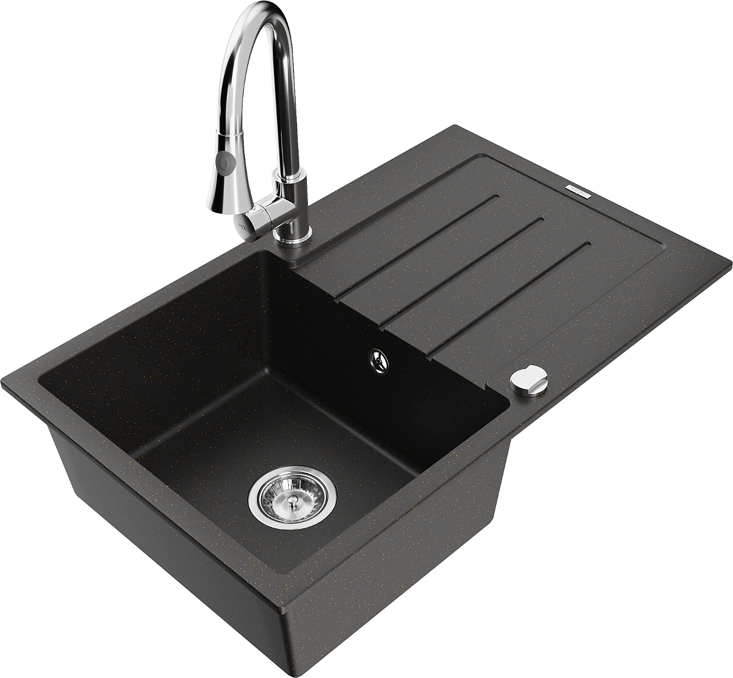 Mexen Bruno egymedencés gránit mosogató csepegtetővel és Elia konyhai csappal, fekete/arany metál - 6513-75-670101-00