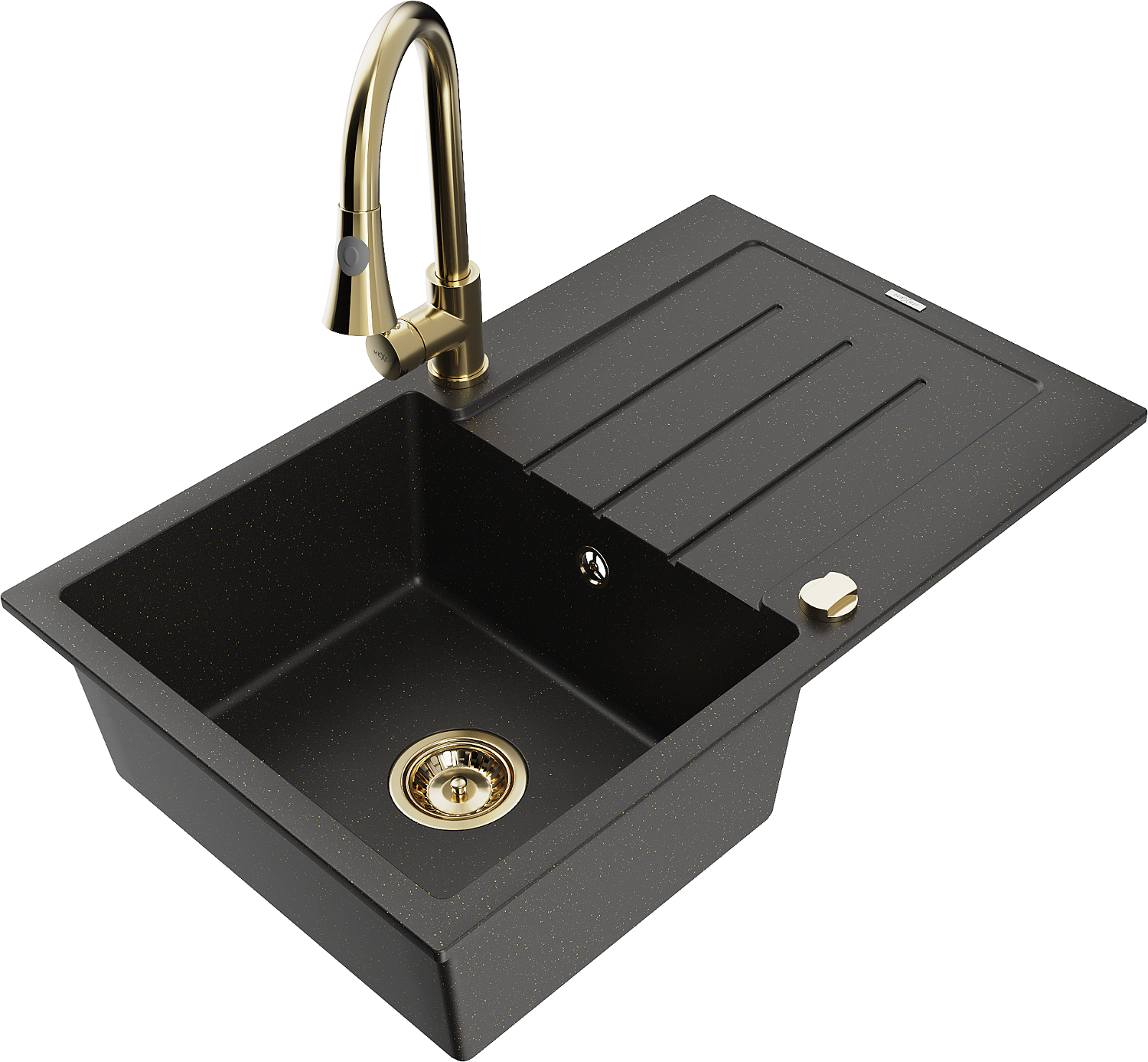Mexen Bruno 1-medencés gránit mosogató csepptálcával és Elia konyhai csappal, fekete/arany metál - 6513-75-670101-50