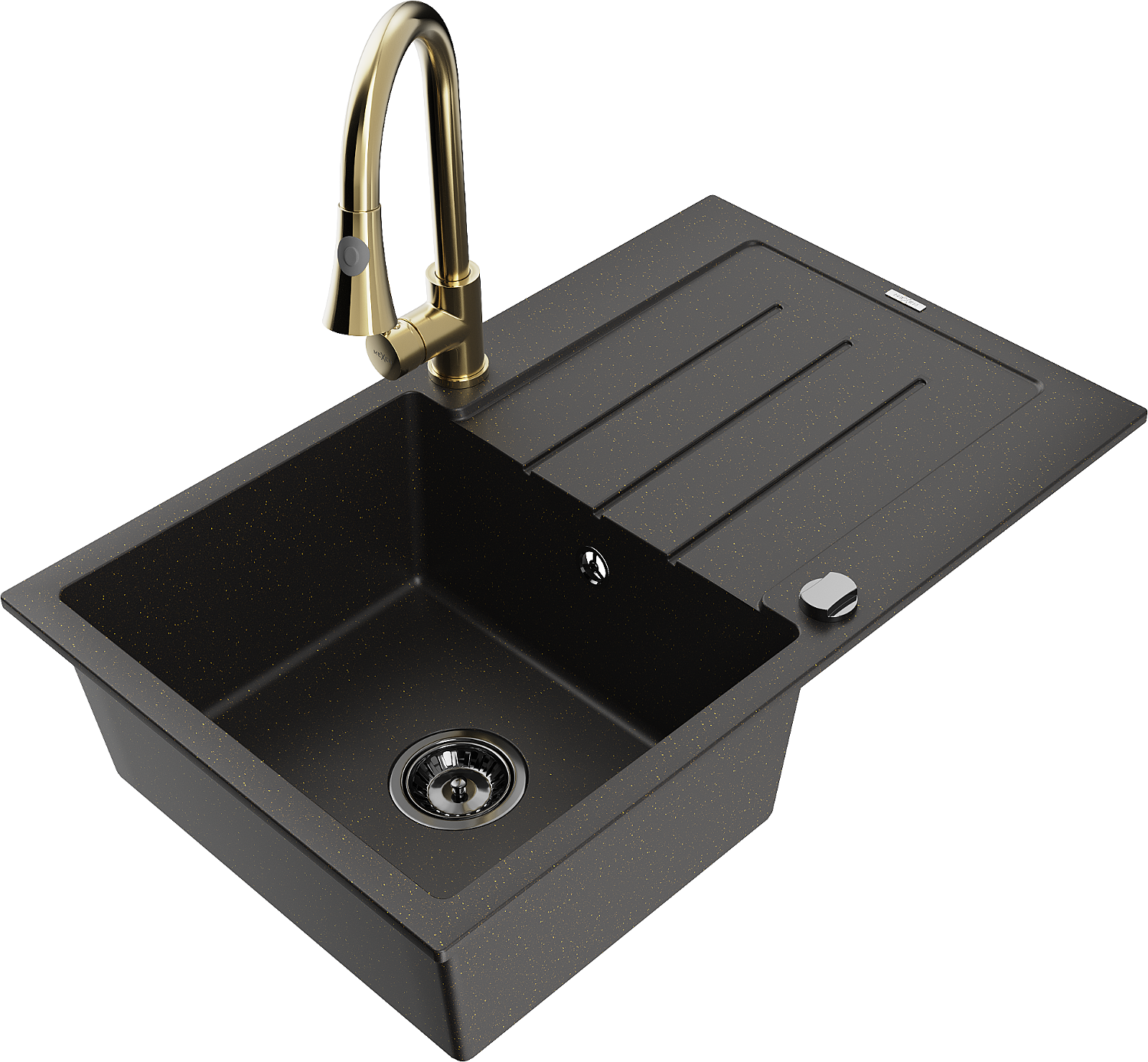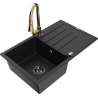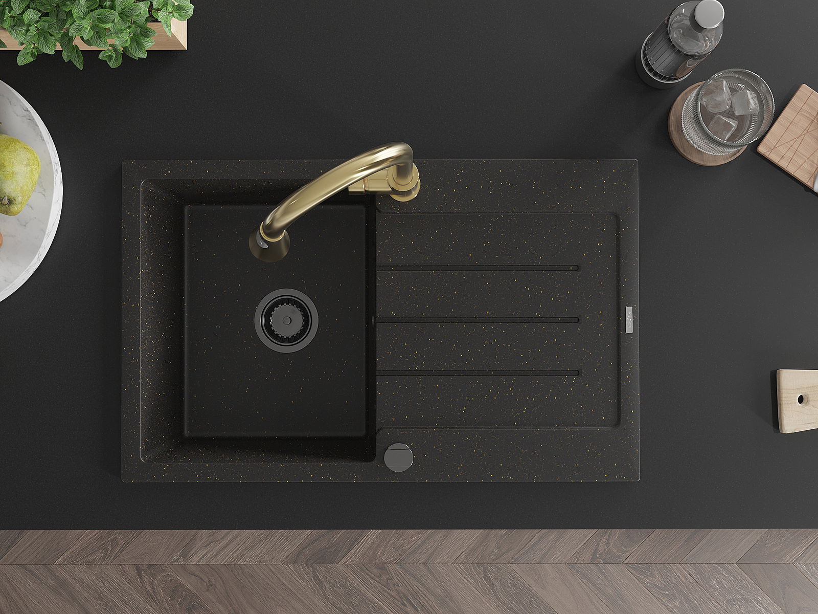 Mexen Bruno egykamrás gránit mosogatótálca csepegtetővel és Elia konyhai csapteleppel, fekete/arany metál - 6513-75-670101-50-B