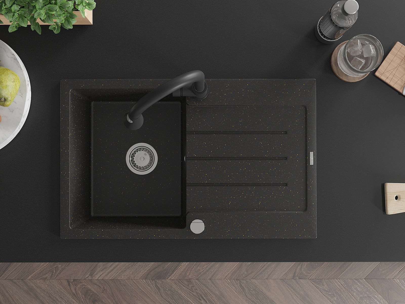 Mexen Bruno gránit konyhai mosogató 1-medencés csepegtetővel és Elia konyhai csapteleppel, fekete/arany metál - 6513-75-670101-?