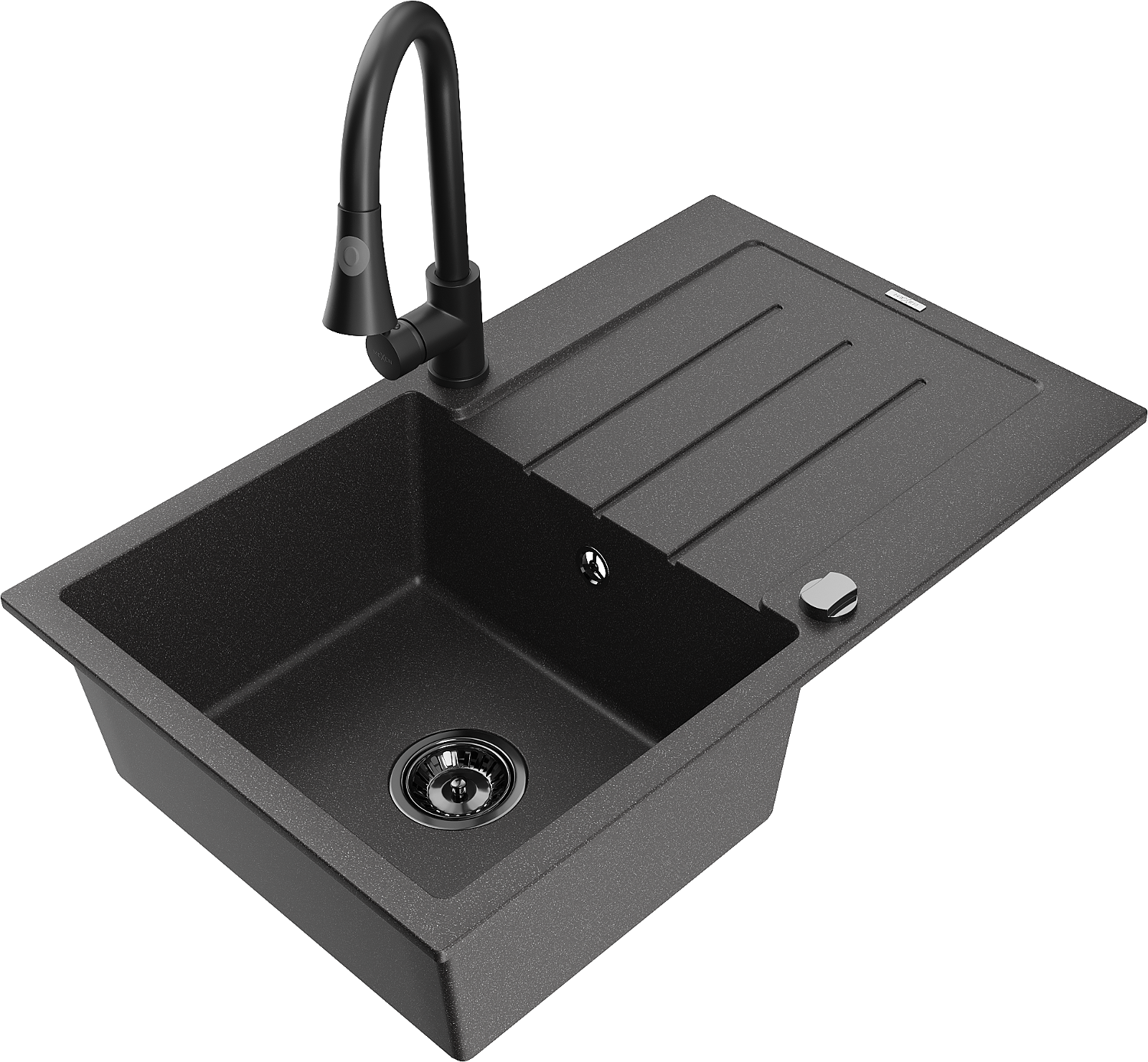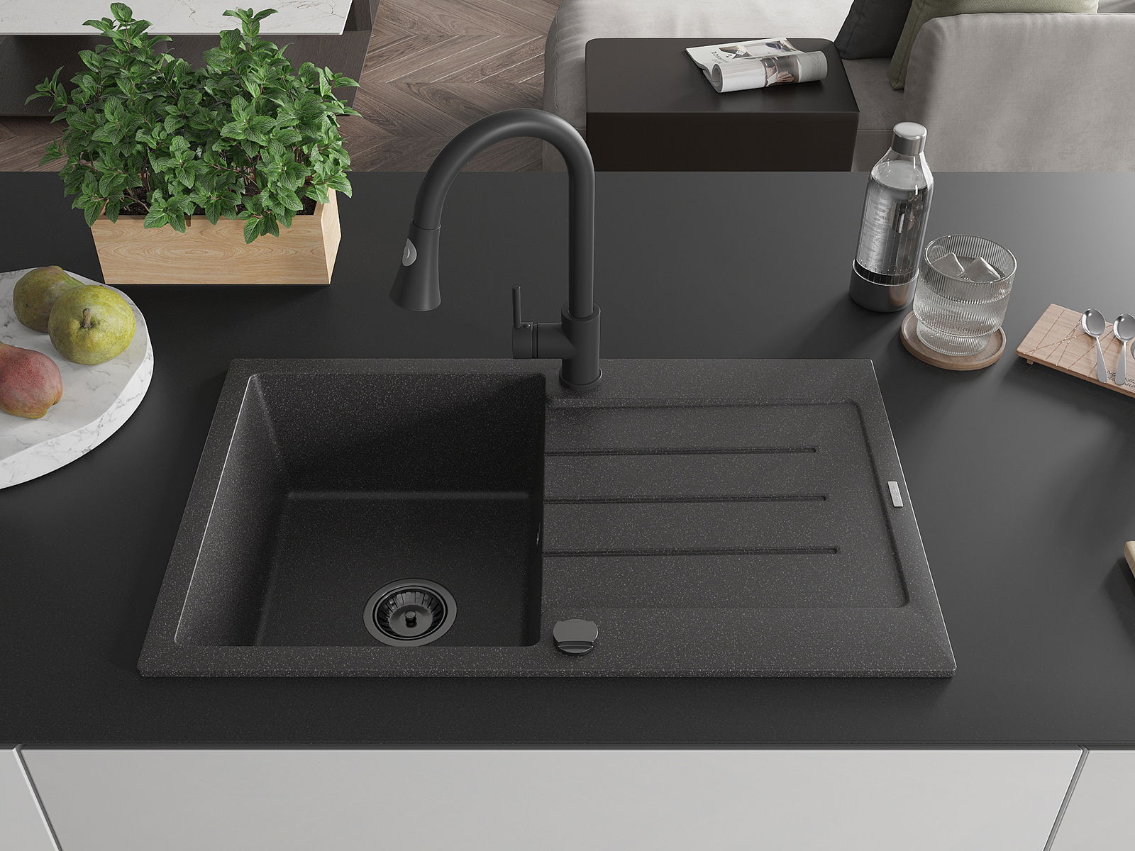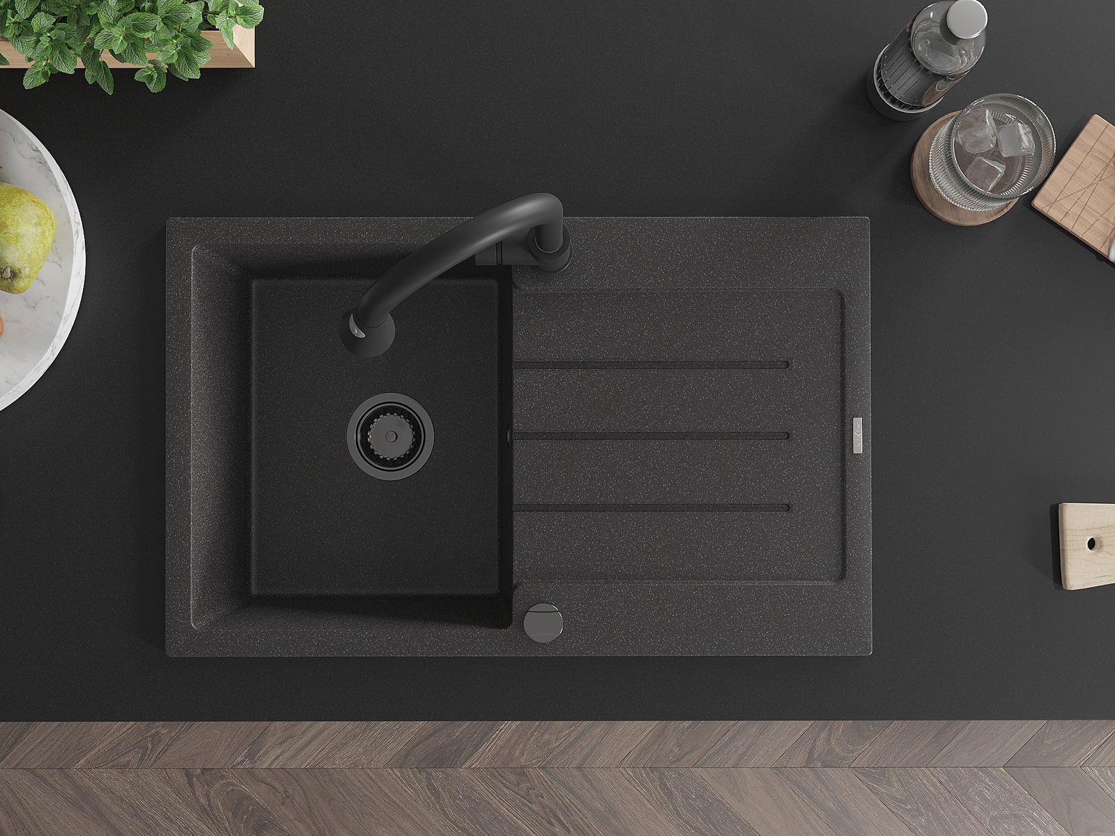 Mexen Bruno 1-medencés gránit mosogató csepegtetővel és Elia konyhai csapteleppel, fekete pöttyös - 6513-76-670101-70-B