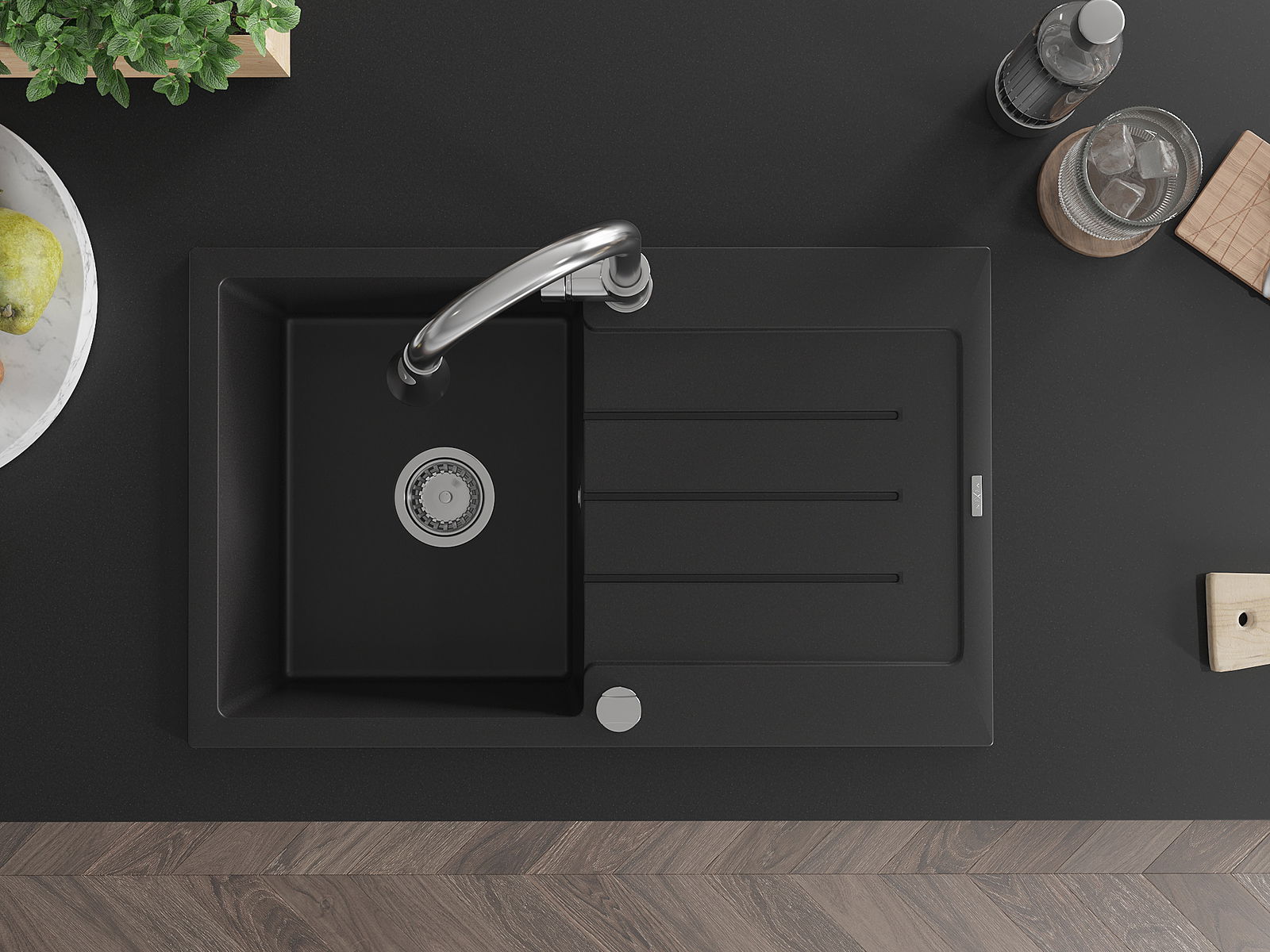 Mexen Bruno egymedencés gránit mosogató csepegtetővel és Elia konyhai csapteleppel, fekete - 6513-77-670101-00