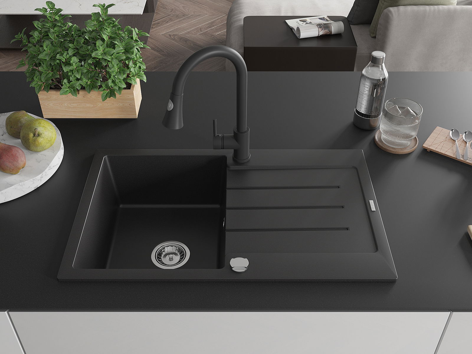 Mexen Bruno 1-medencés gránit mosogató csepegtetővel és Elia konyhai csapteleppel, fekete - 6513-77-670101-70