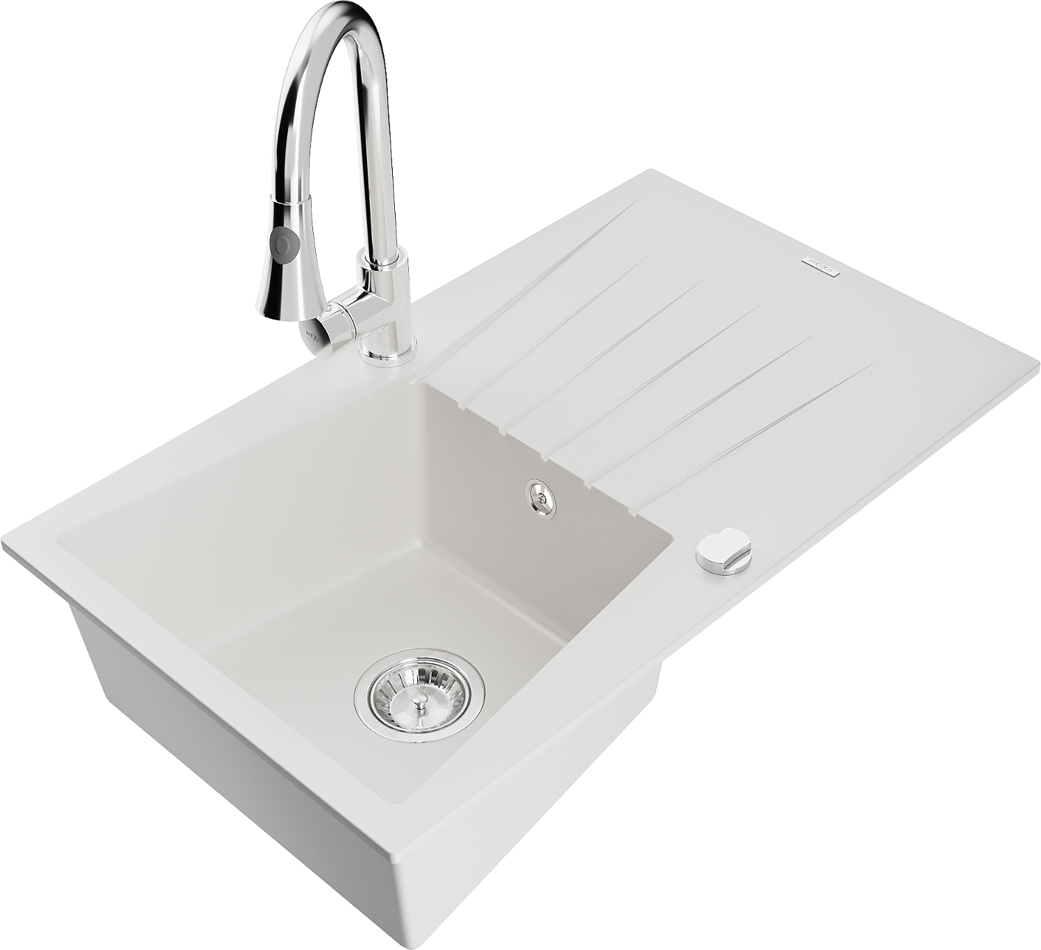 Mexen Cesar 1-medencés gránit mosogató csepegtetővel és Elia konyhai csapteleppel, fehér - 6514-20-670101-00