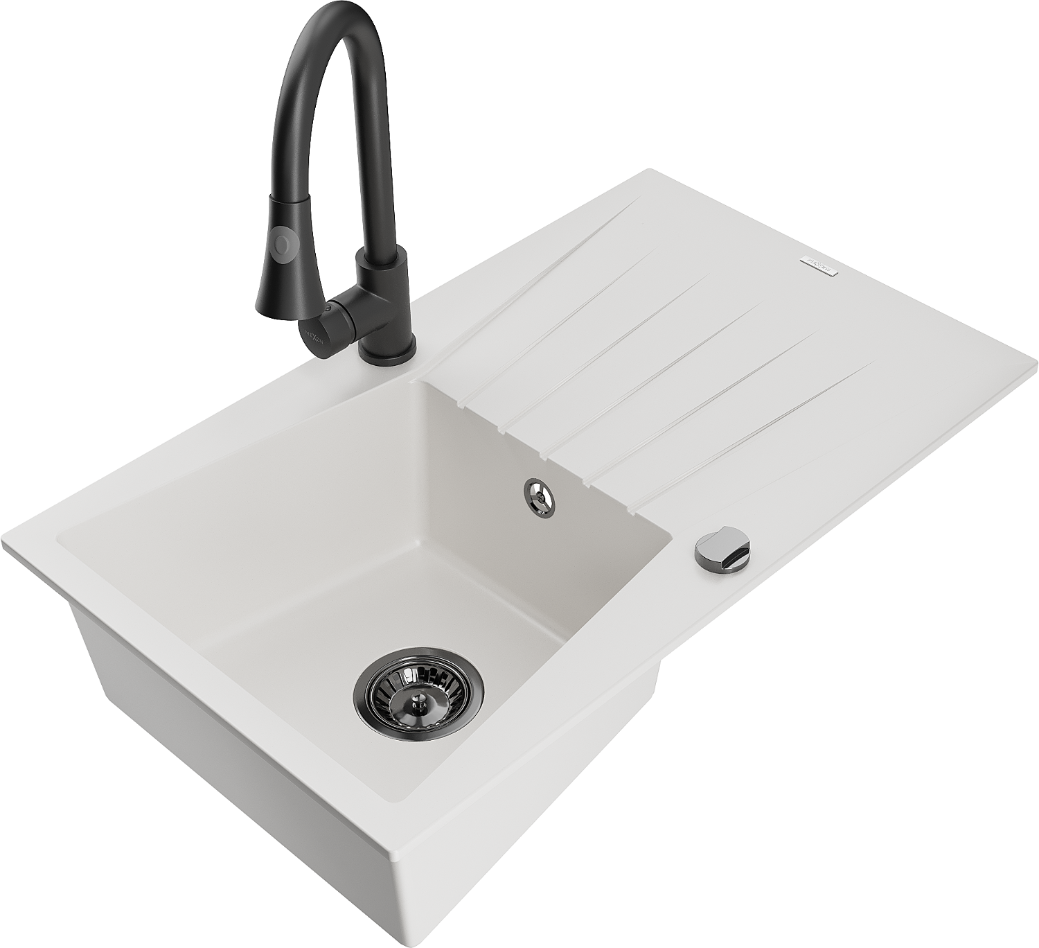 Mexen Cesar gránit mosogató 1-medencés csepegtetővel és Elia konyhai csapteleppel, fehér - 6514-20-670101-70