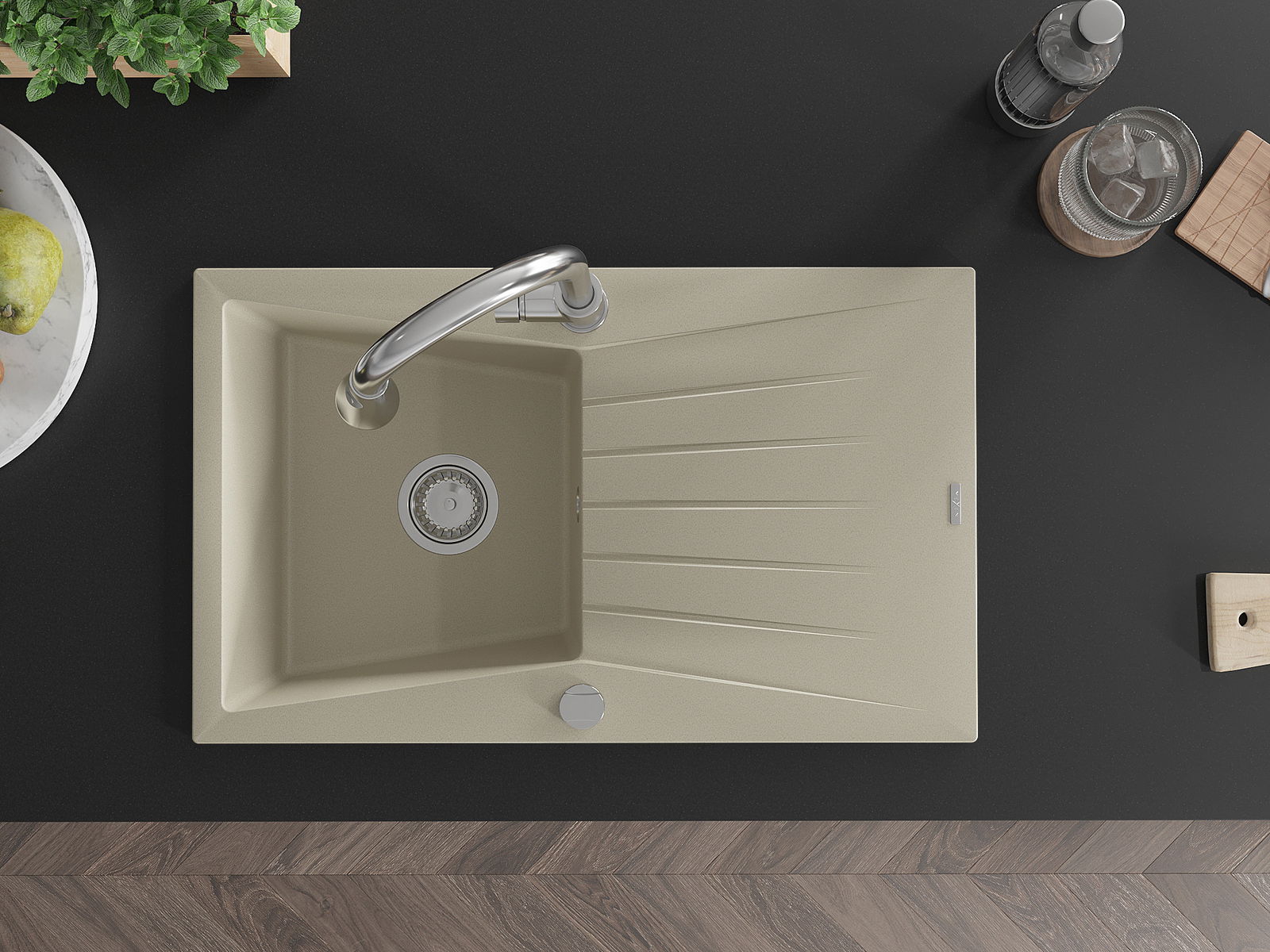 A mosogató kiváló minőségű gránitból készül. Ez egy elegáns és mindenekelőtt minden konyhához praktikus kiegészítés, stílusától függetlenül. A kiváló minőségű és a gránit tartósság biztosítja a sok éves használatát.