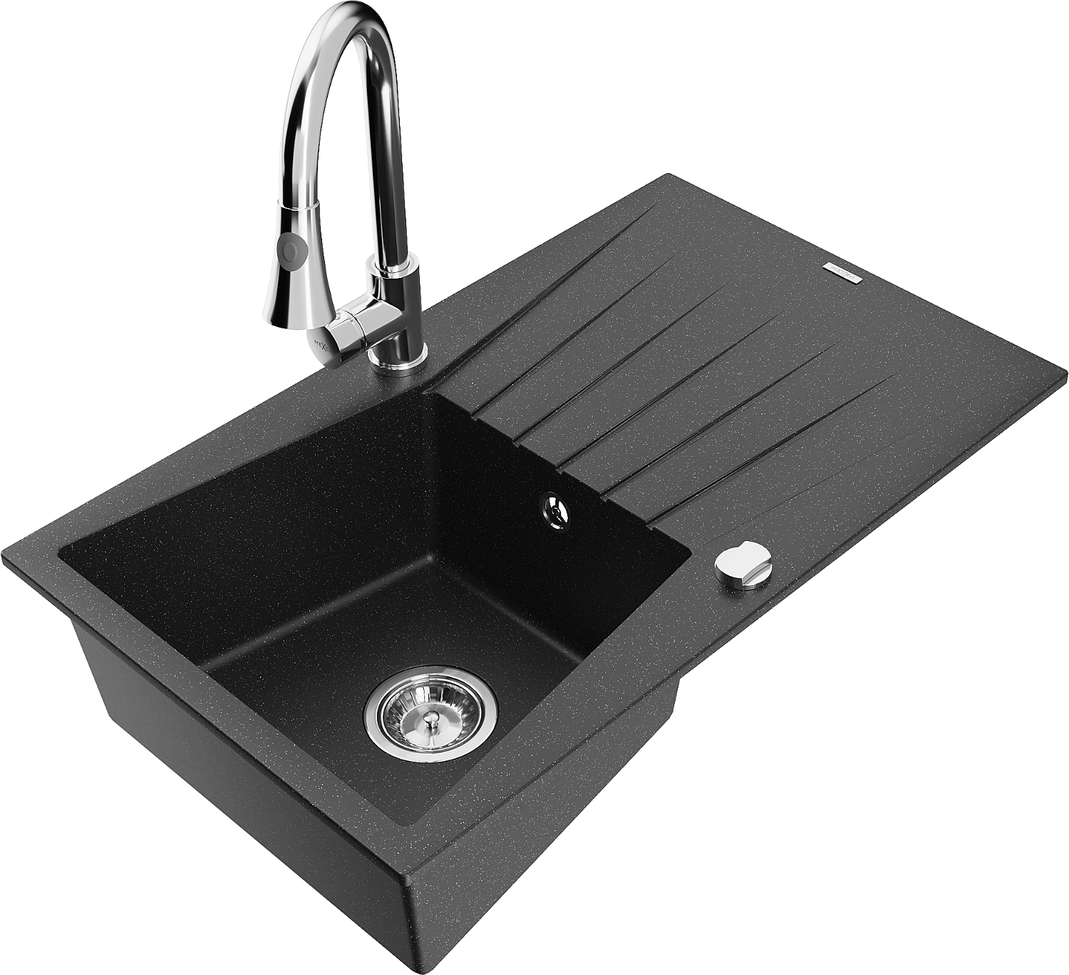 Mexen Cesar 1-medencés gránit mosogató csepegtetővel és Elia konyhai csapteleppel, fekete/ezüst metál - 6514-73-670101-00