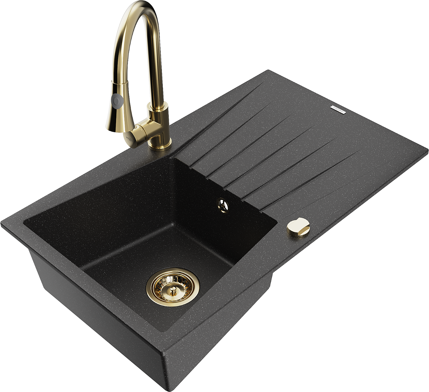 Mexen Cesar gránit mosogató 1-medencés csepegtetővel és Elia konyhai csapteleppel, fekete/ezüst metál - 6514-73-670101-50