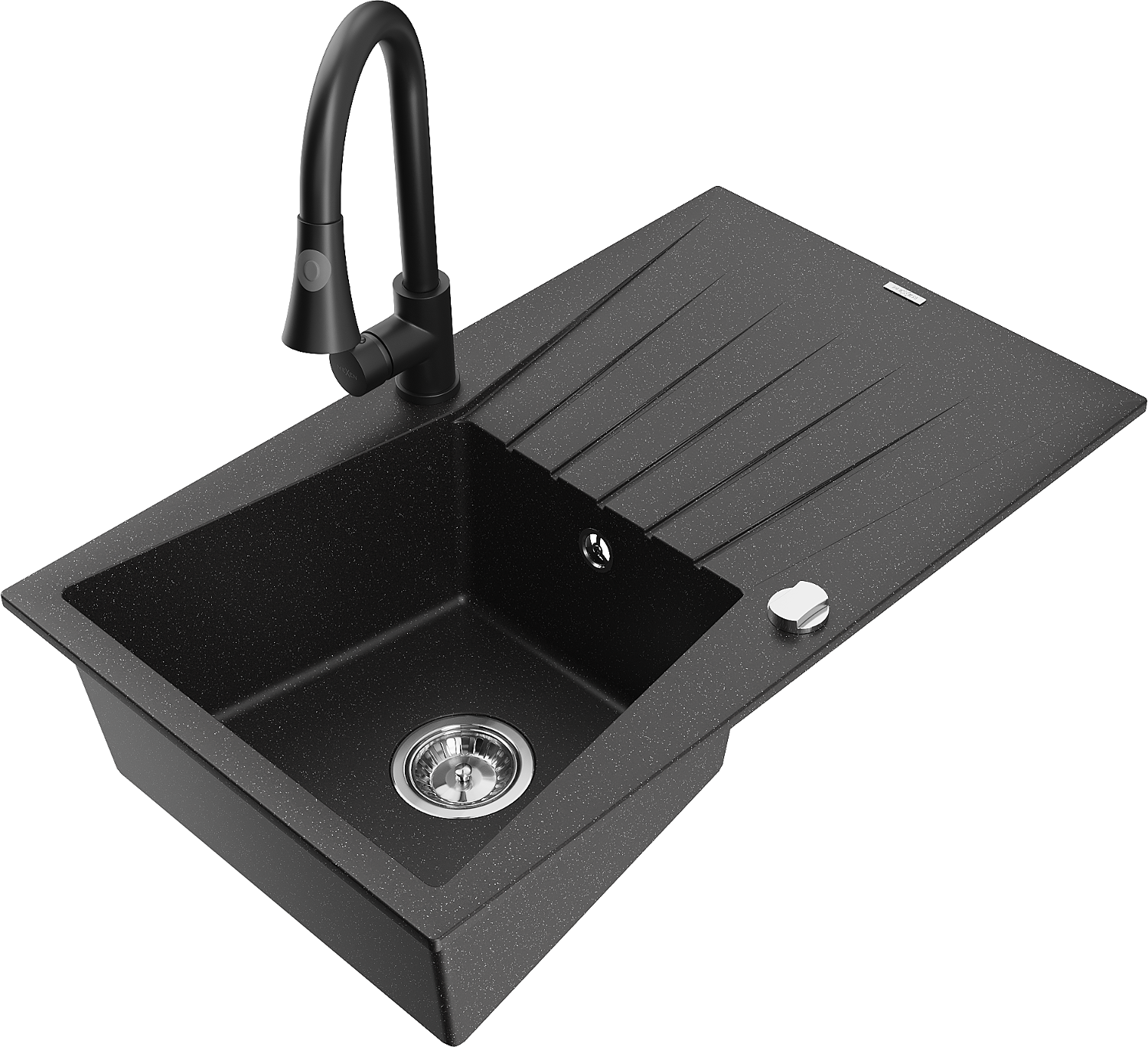 Mexen Cesar 1-medencés gránit mosogató lefolyóval és Elia konyhai csappal, fekete/ezüst metál - 6514-73-670101-70