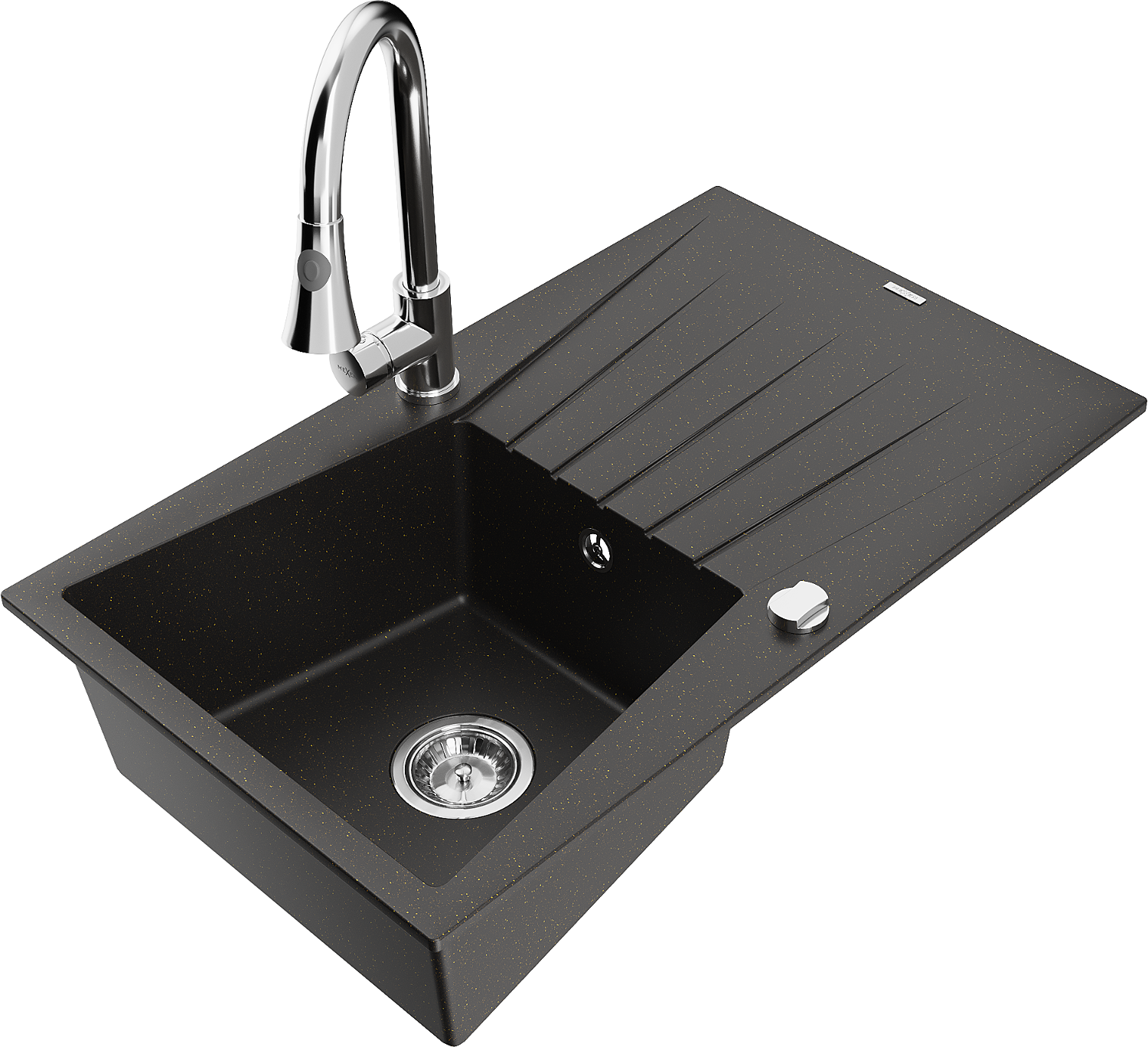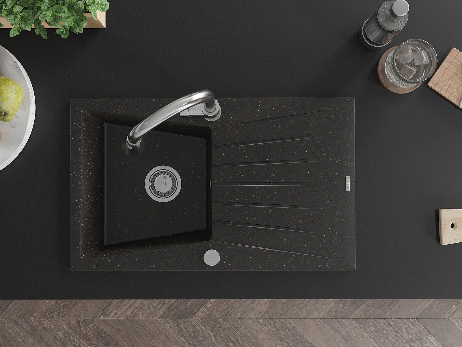 Mexen Cesar 1-kamrás gránit mosogató csepegtetővel és Elia konyhai csapteleppel, fekete/arany metál - 6514-75-670101-00