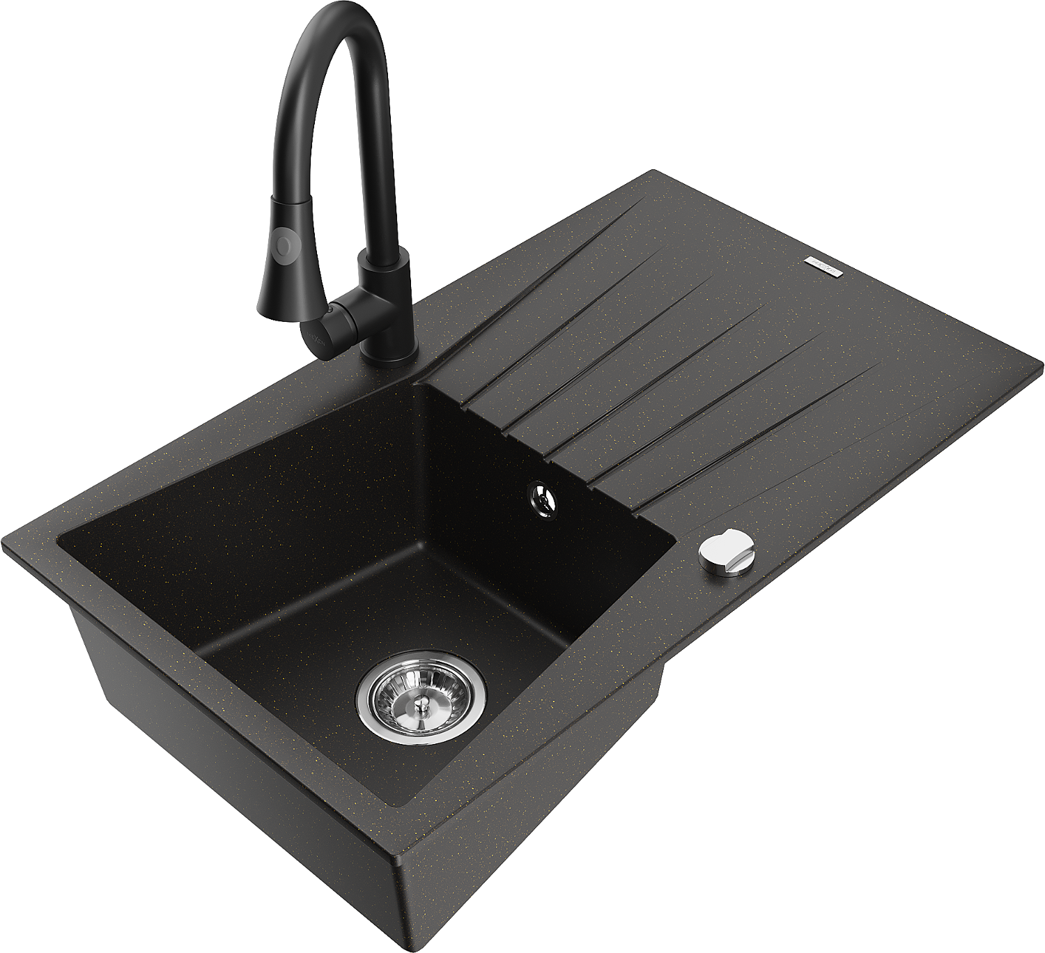Mexen Cesar 1-medencés gránit mosogató csepegtetővel és Elia konyhai csappal, fekete/arany metál - 6514-75-670101-70