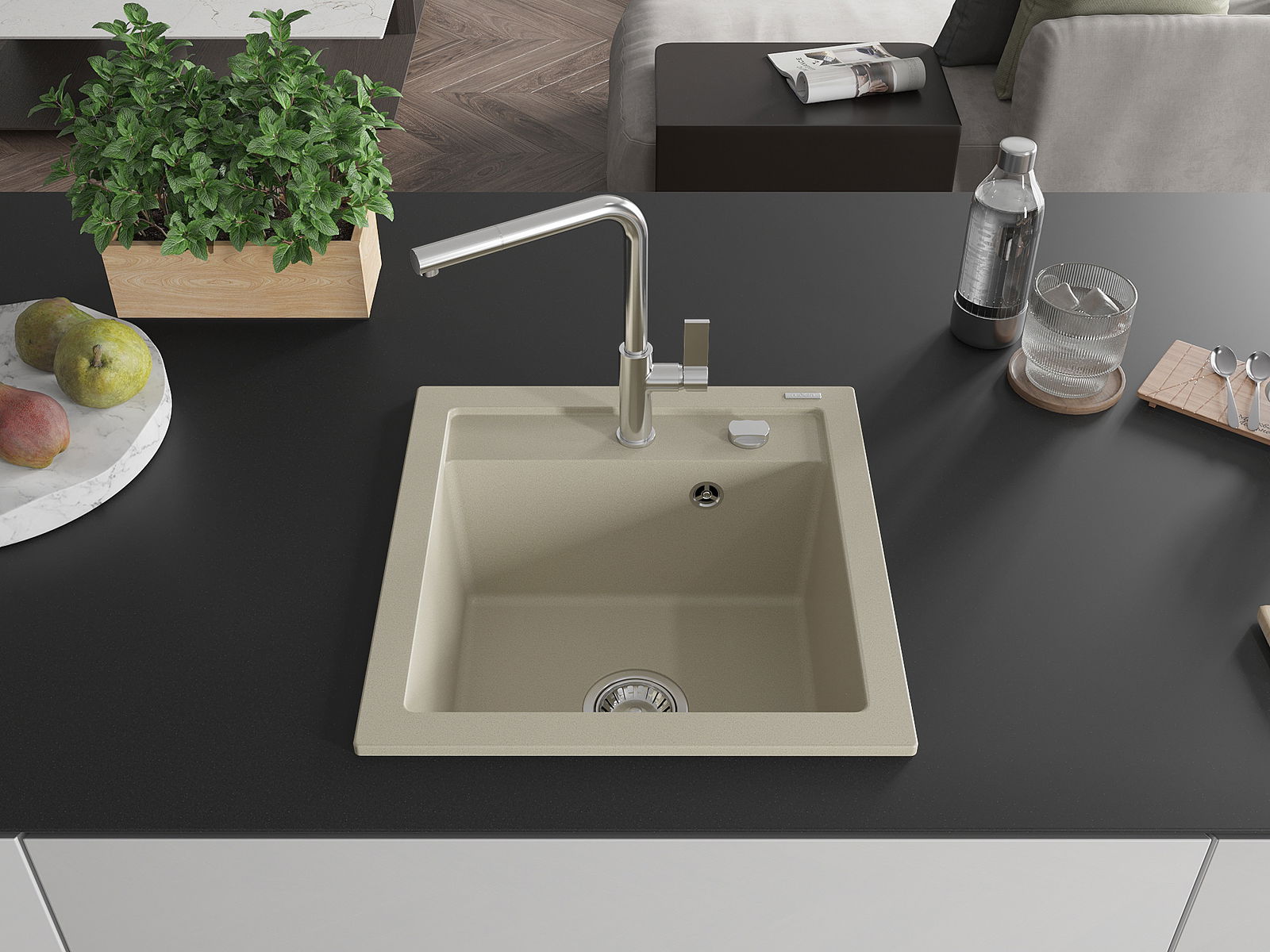 A mosogató kiváló minőségű gránitból készül. Ez egy elegáns és mindenekelőtt minden konyhához praktikus kiegészítés, stílusától függetlenül. A kiváló minőségű és a gránit tartósság biztosítja a sok éves használatát.