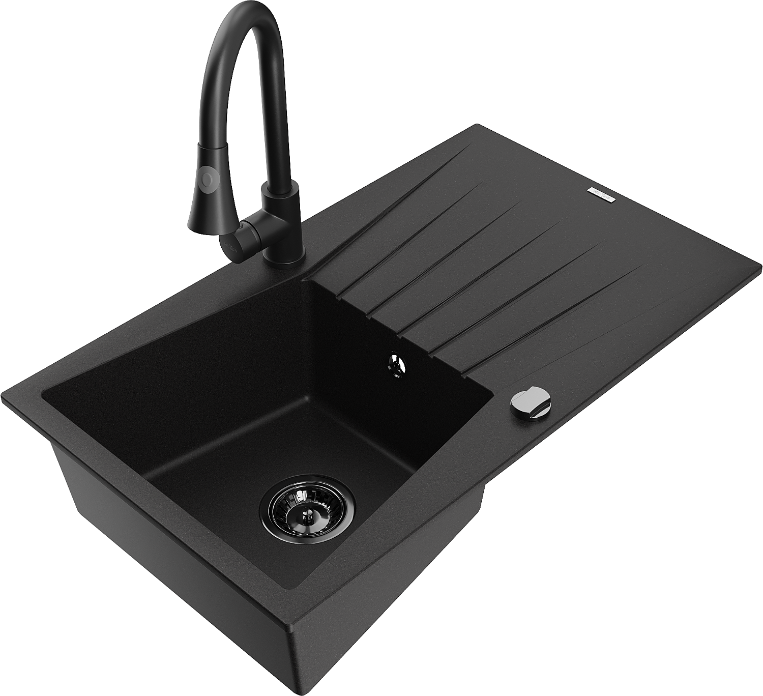 Mexen Cesar egymedencés gránit mosogató csepegtetővel és Elia konyhai csapteleppel, fekete - 6514-77-670101-70-B