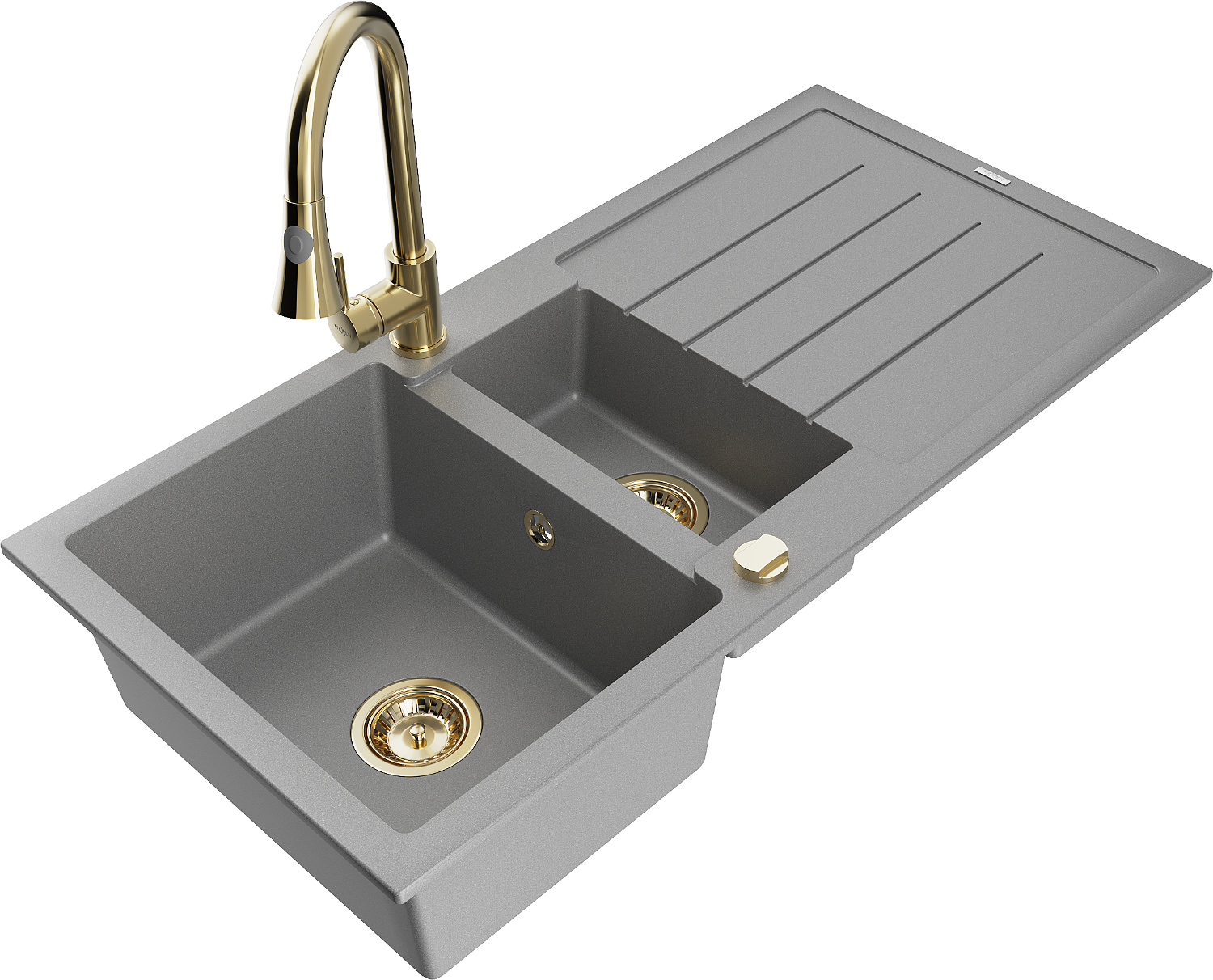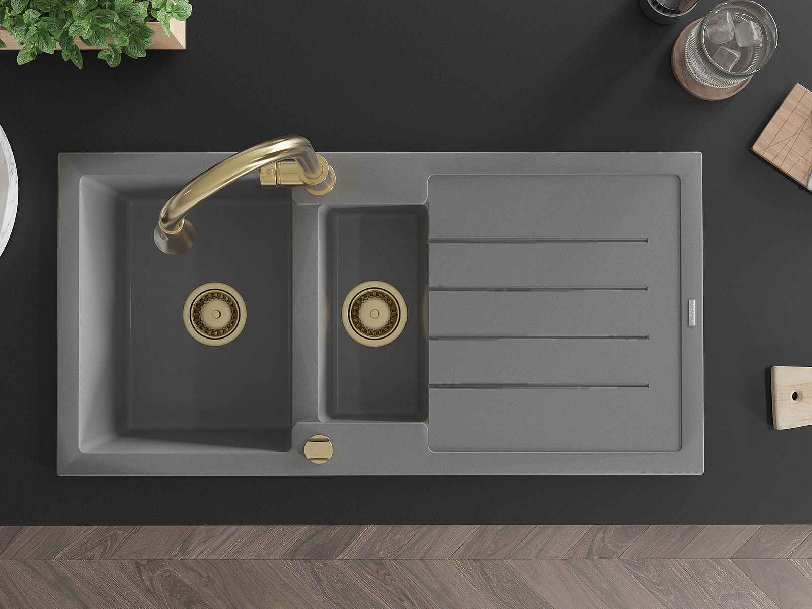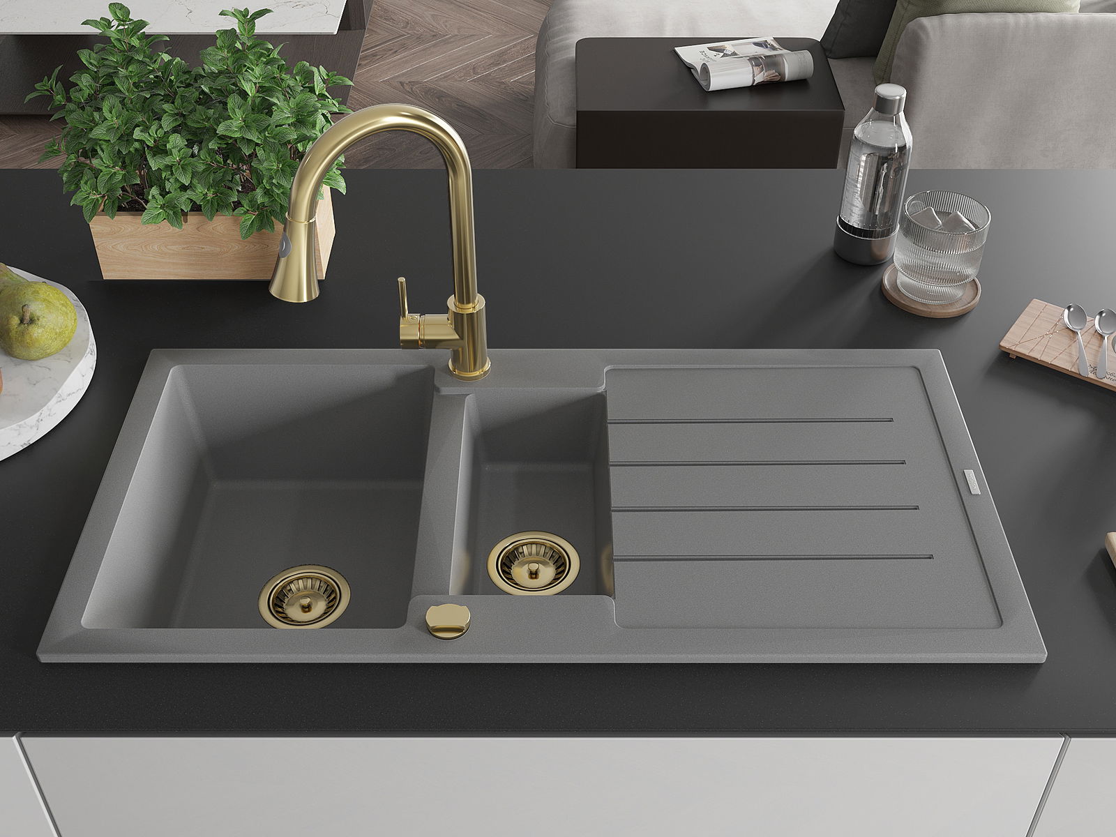 Mexen Andres gránit mosogató 1,5 rekeszes csepegtetővel és Elia konyhai csappal, szürke - 6515-71-670101-50