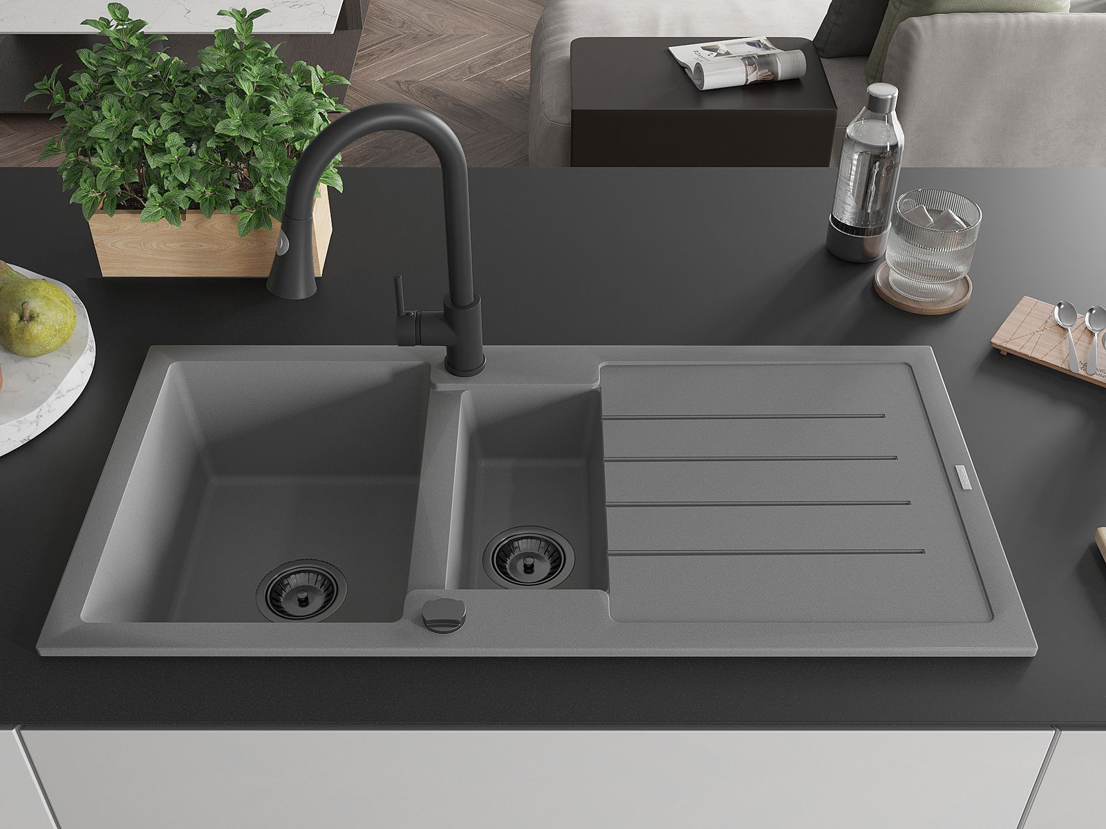 Mexen Andres 1,5 kamrás gránit mosogató csepegtetővel és Elia konyhai csapteleppel, szürke - 6515-71-670101-70-B