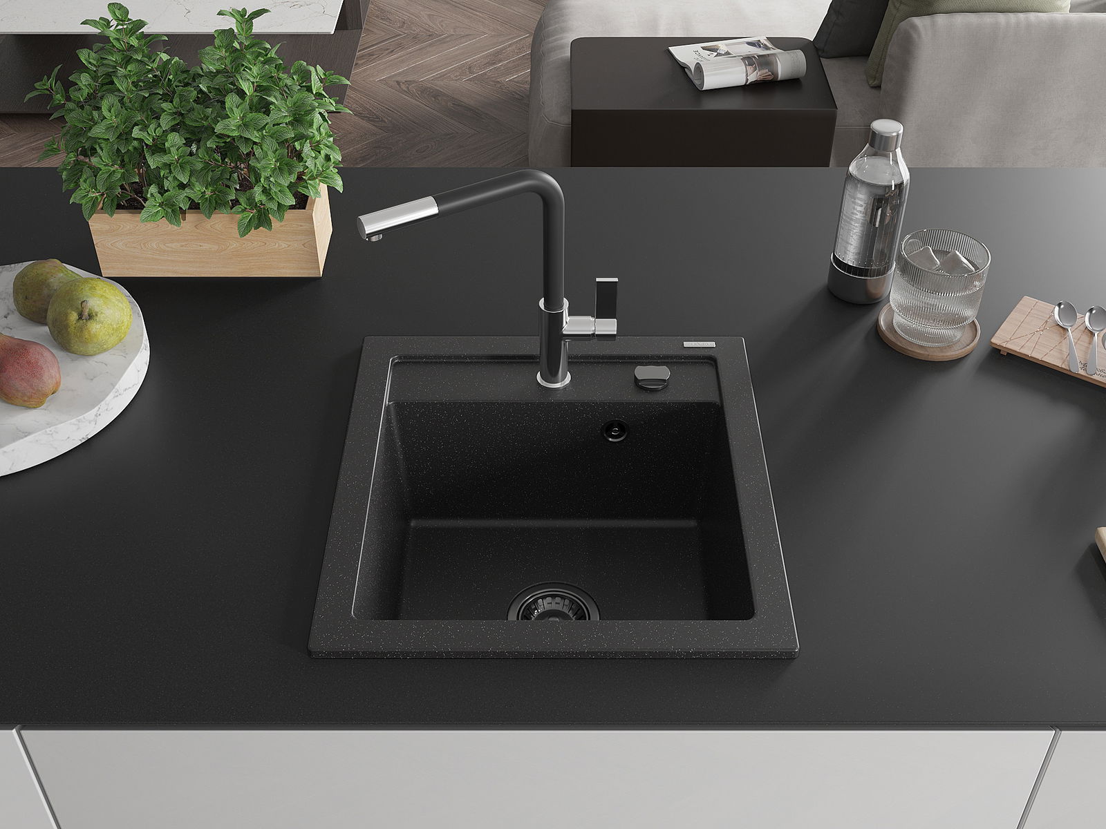 Mexen Vito 1-medencés gránit mosogató Flora konyhai csapteleppel, fekete/ezüst metál - 6503-73-670401-07-B