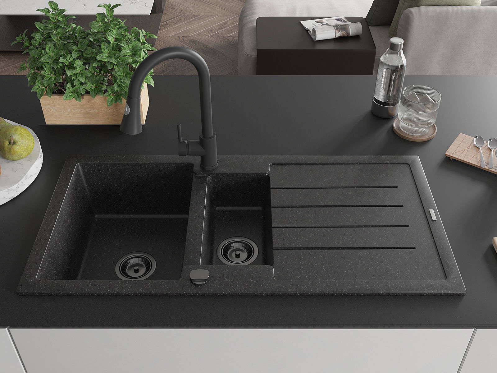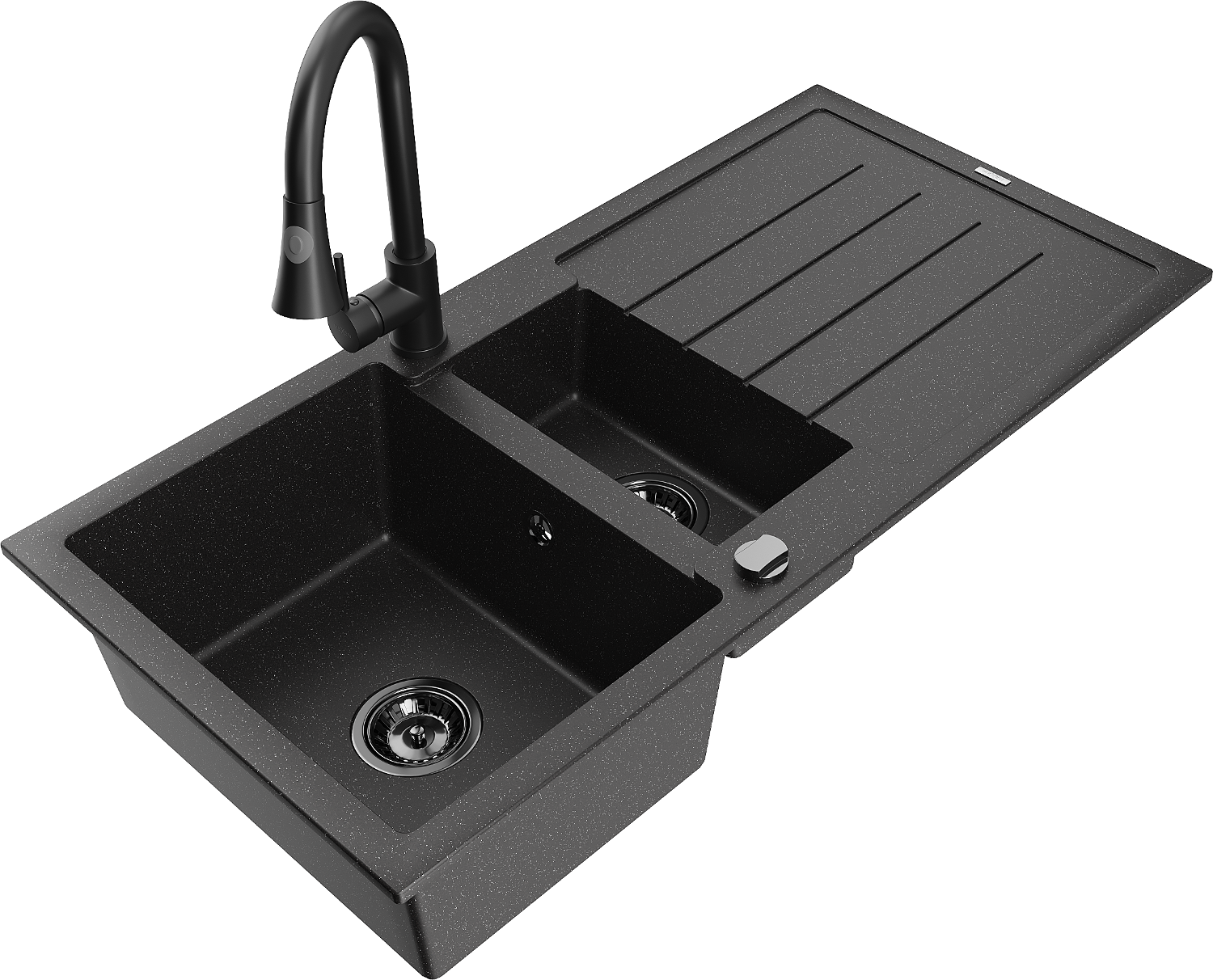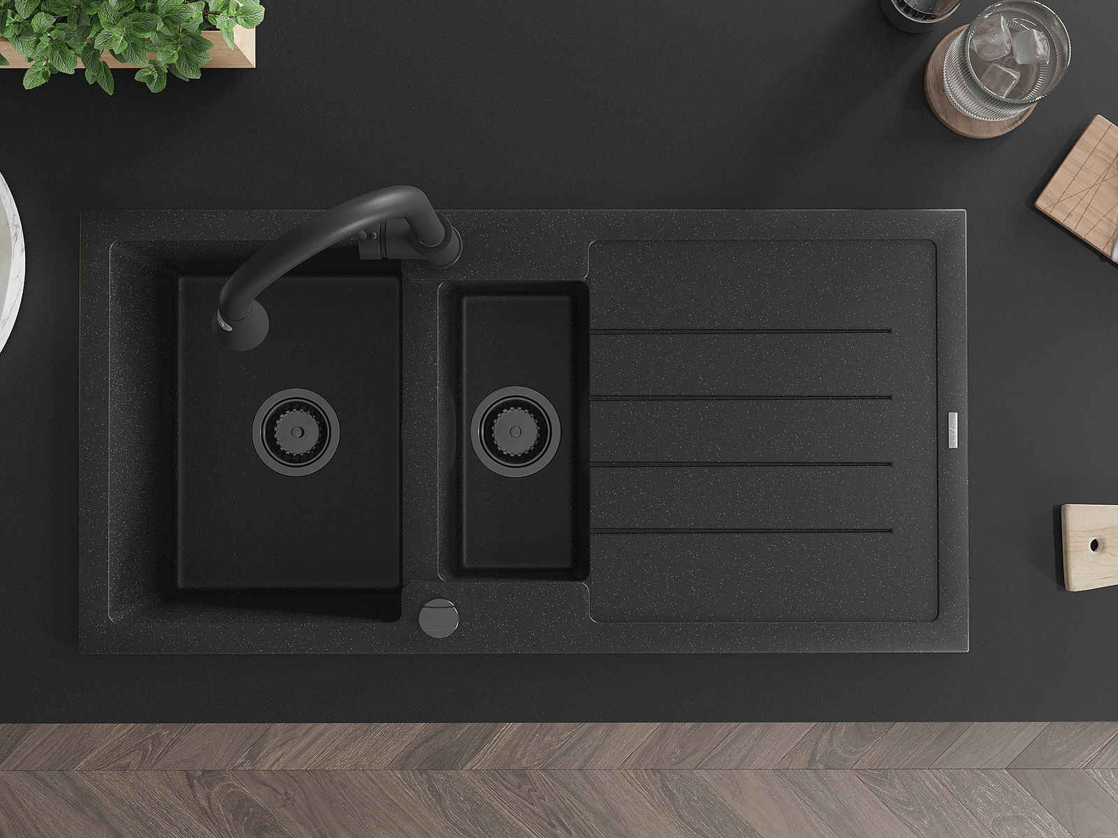Mexen Andres gránit mosogató 1,5-medencés csepptálcával és Elia konyhai csappal, fekete/ezüst - 6515-73-670101-70-B