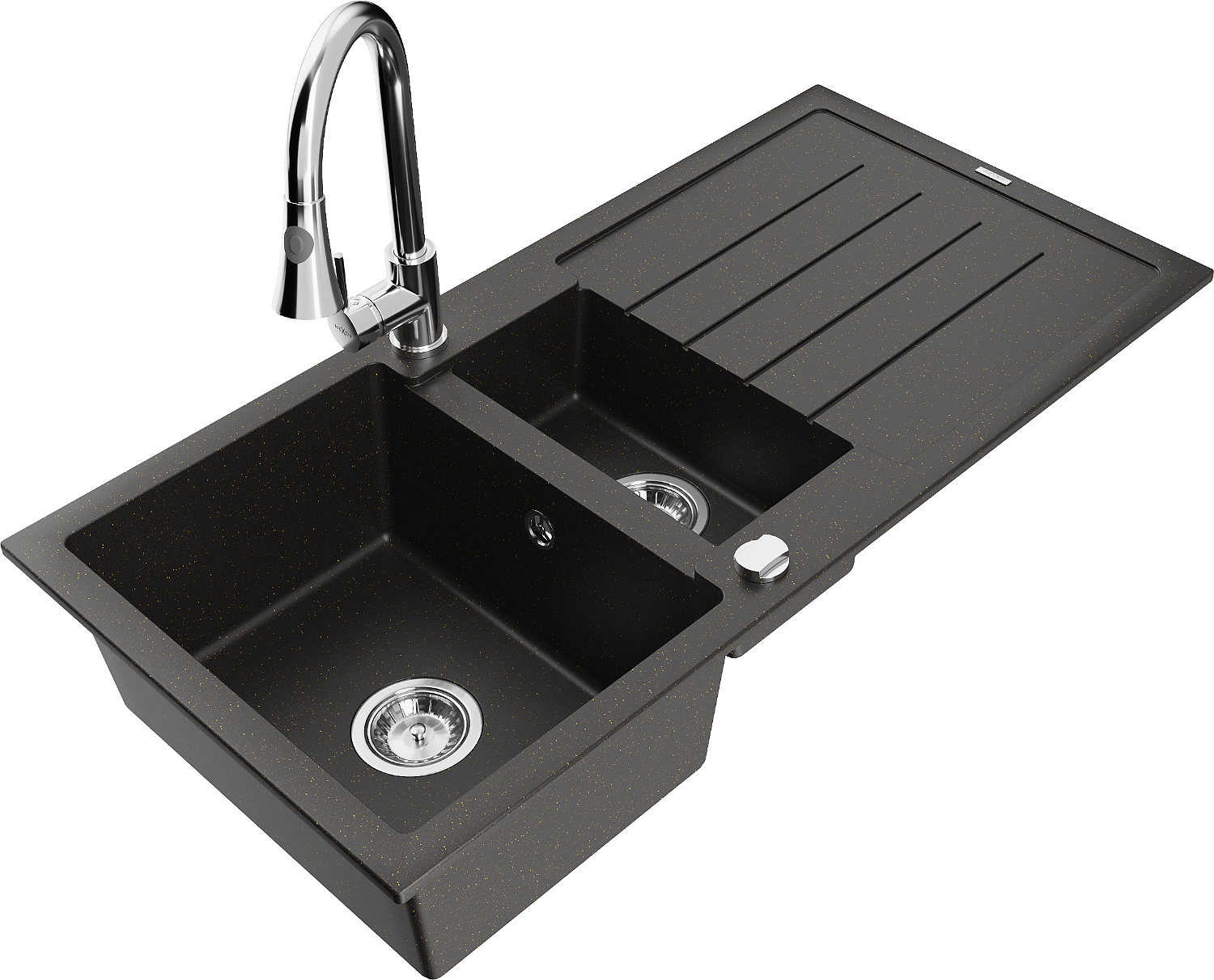 Mexen Andres gránit 1,5-medencés mosogató lecsurgóval és Elia konyhai csapteleppel, fekete/arany metál - 6515-75-670101-00