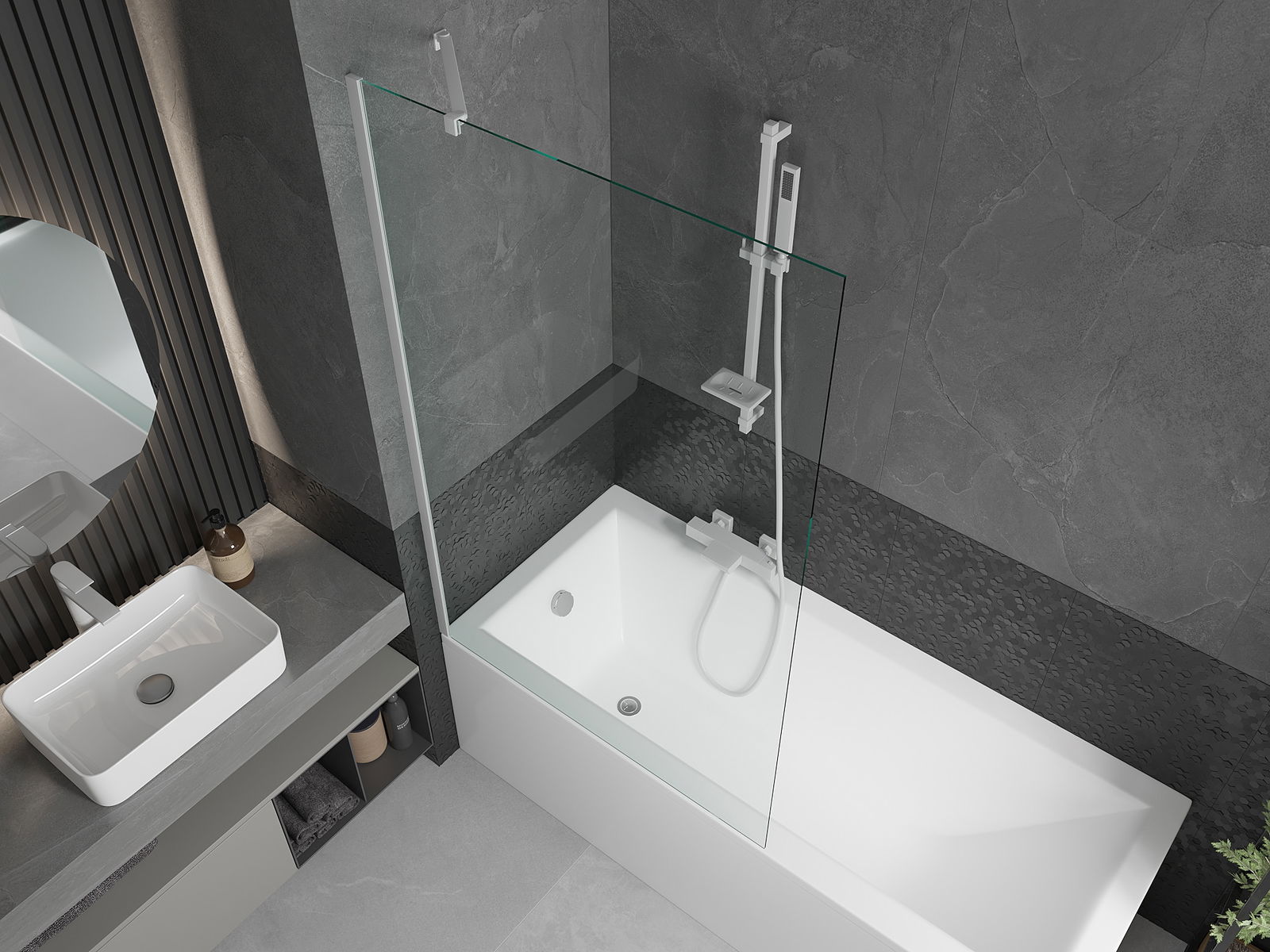 Az univerzális rögzítő rendszer használatával a képernyő jobbra vagy balra szerelhető, az Ön igényeitől függően. Ilyen módon könnyen megtervezheti a fürdőszobához szabott zuhanyt.