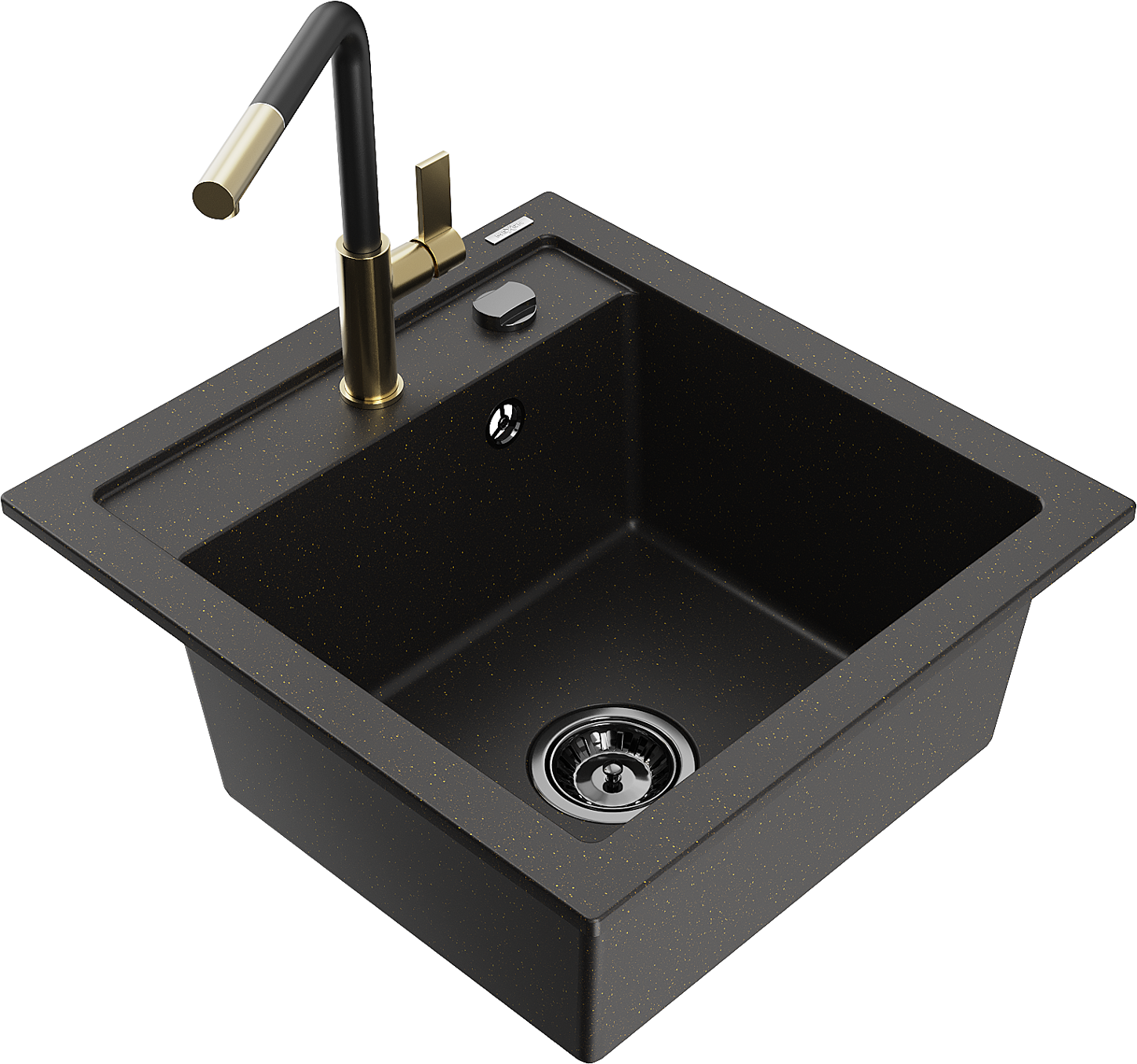 Mexen Vito egymedencés gránit mosogató Flora konyhai csapteleppel, fekete/arany metál - 6503-75-670401-57-B