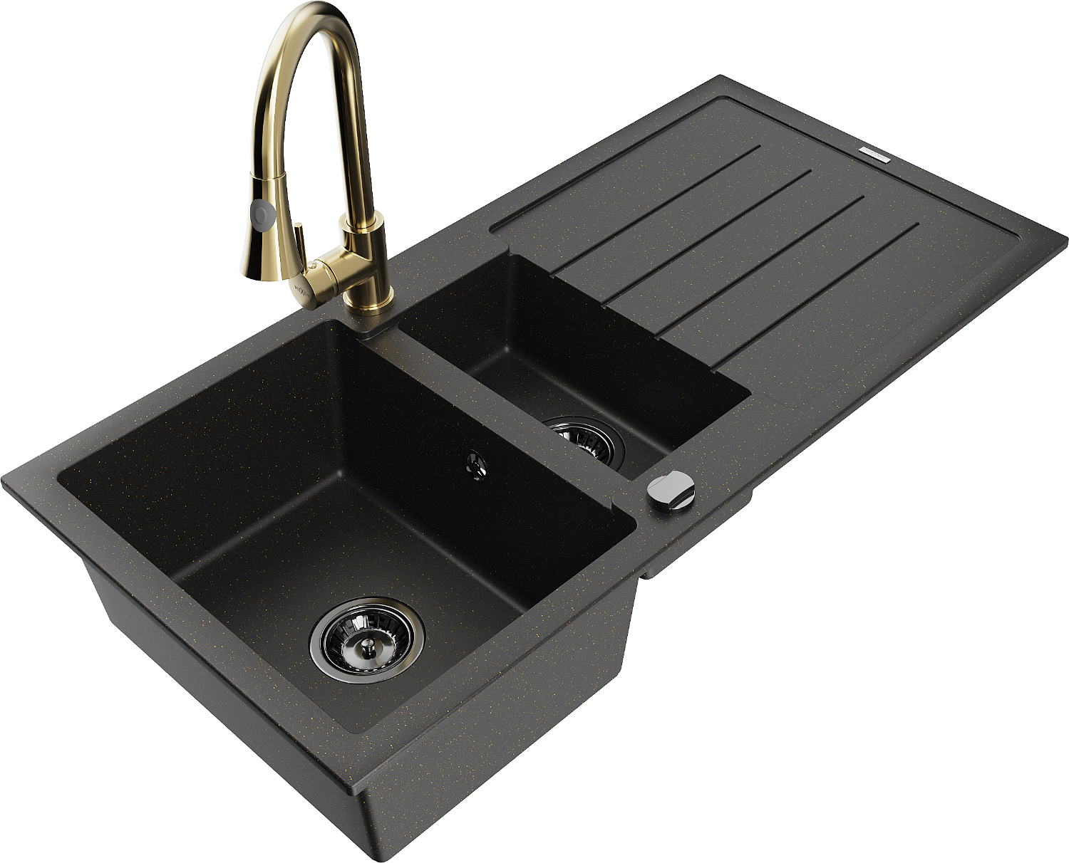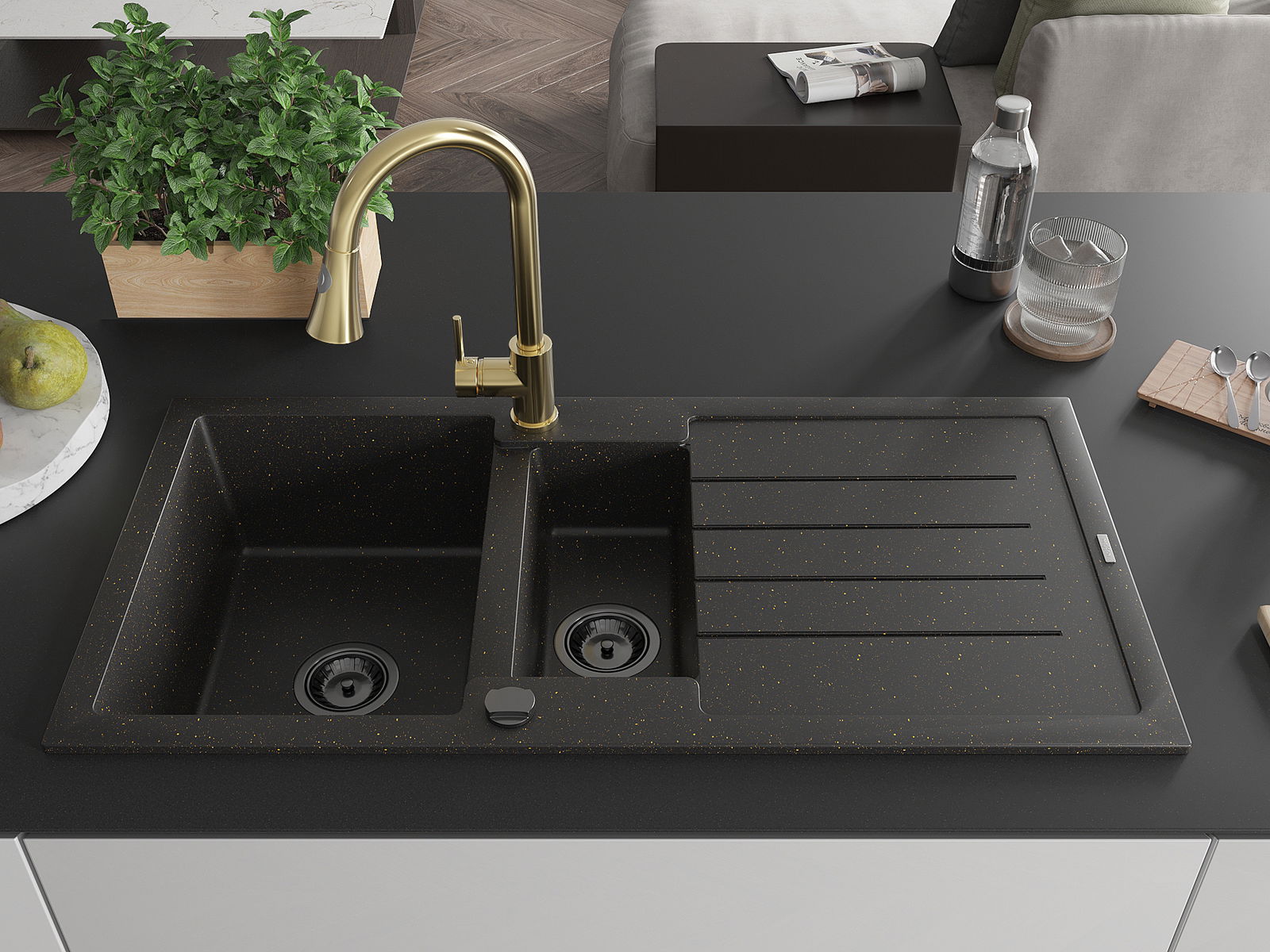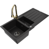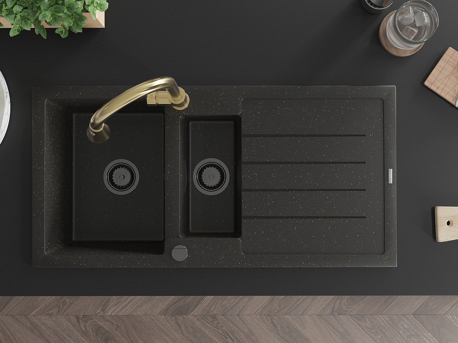 Mexen Andres gránit mosogató 1,5-medencés csepegtetővel és Elia konyhai csapteleppel, fekete/arany metál - 6515-75-670101-50-B