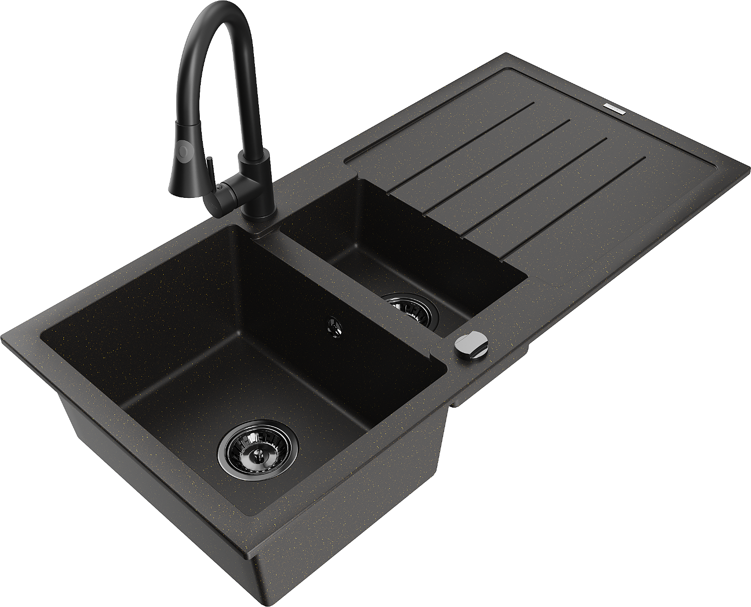 Mexen Andres gránit mosogató 1,5 kamrás csepegtetővel és Elia konyhai csapteleppel, fekete/arany metál - 6515-75-670101-70-B