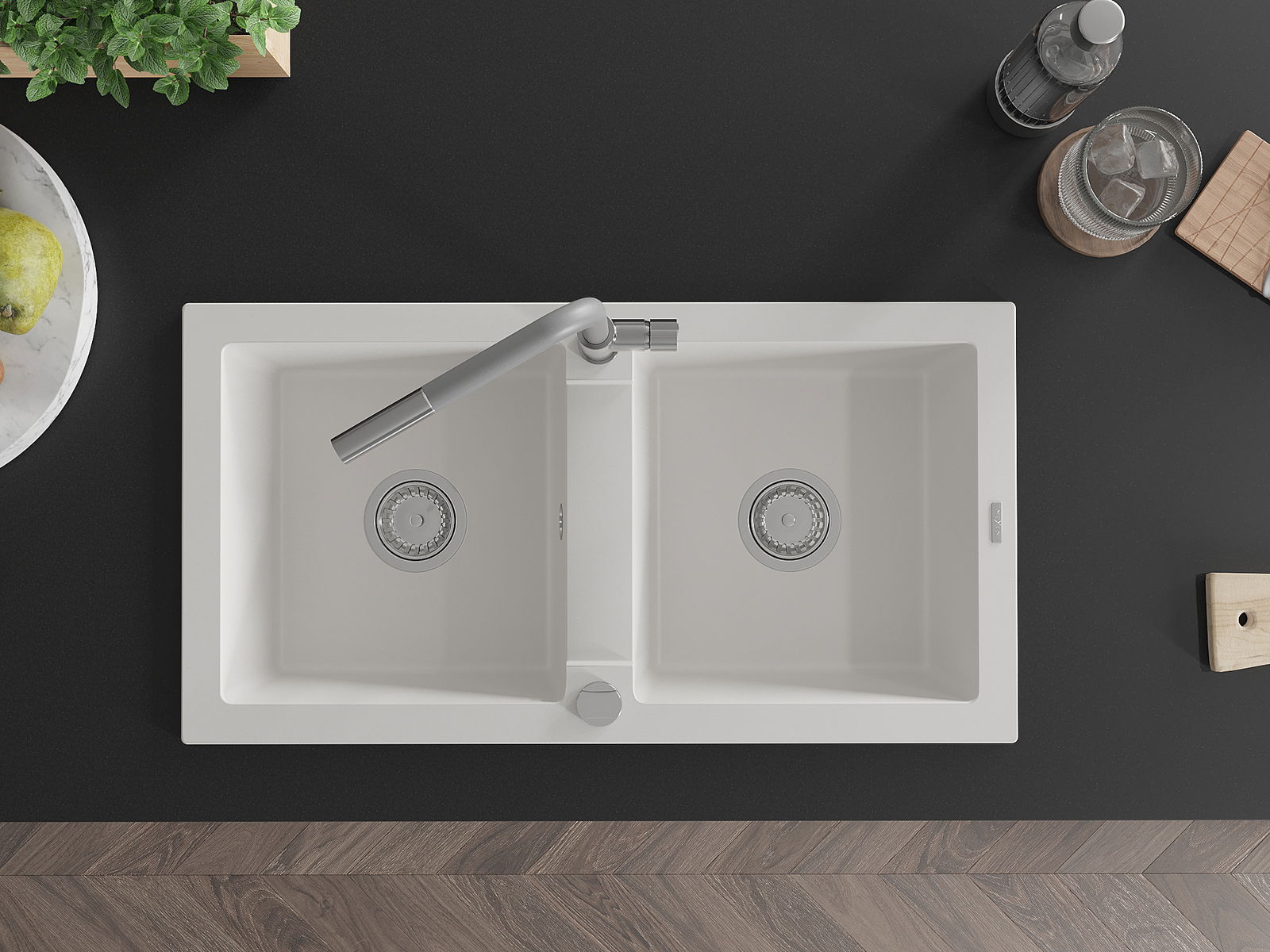 Mexen Mario gránit mosogató 2-medencés konyhai csapteleppel Flora, fehér - 6504-20-670401-06
