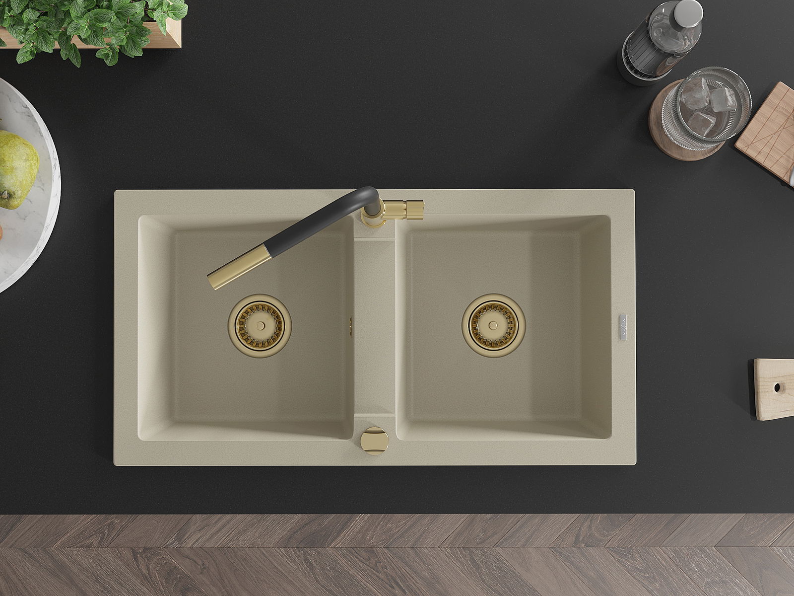 Mexen Mario gránit 2-medencés mosogató Flora konyhai csapteleppel, bézs - 6504-69-670401-57-G