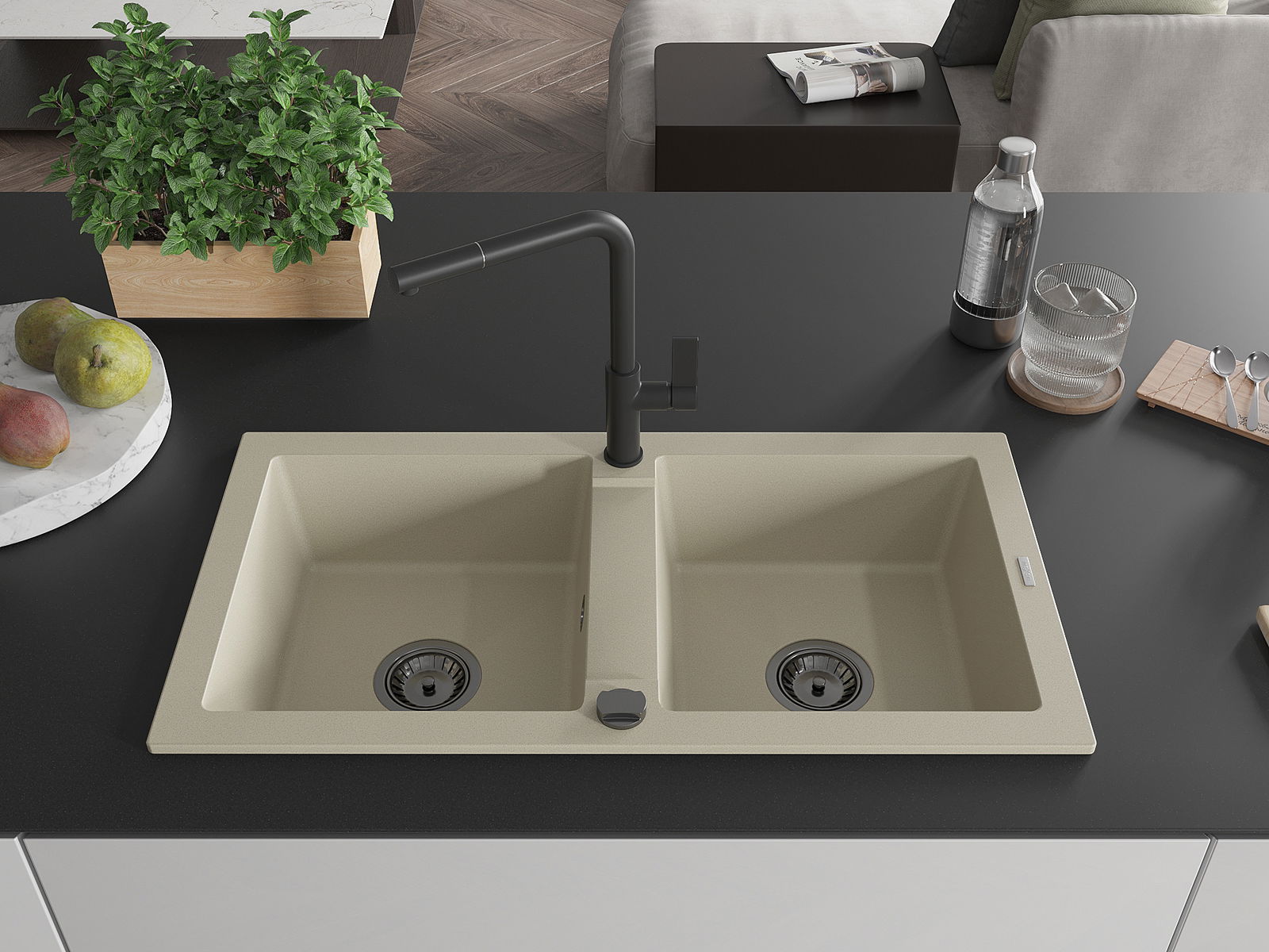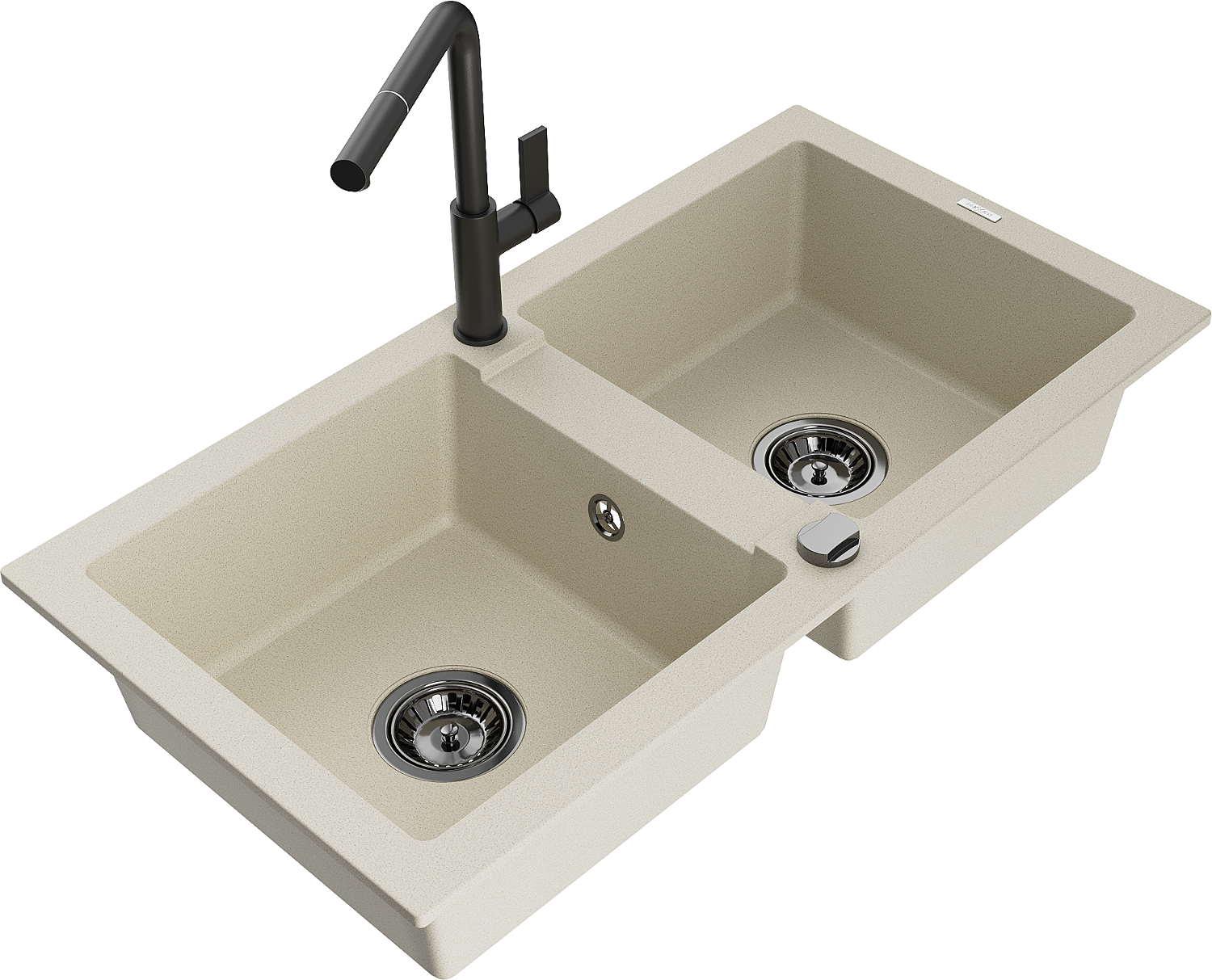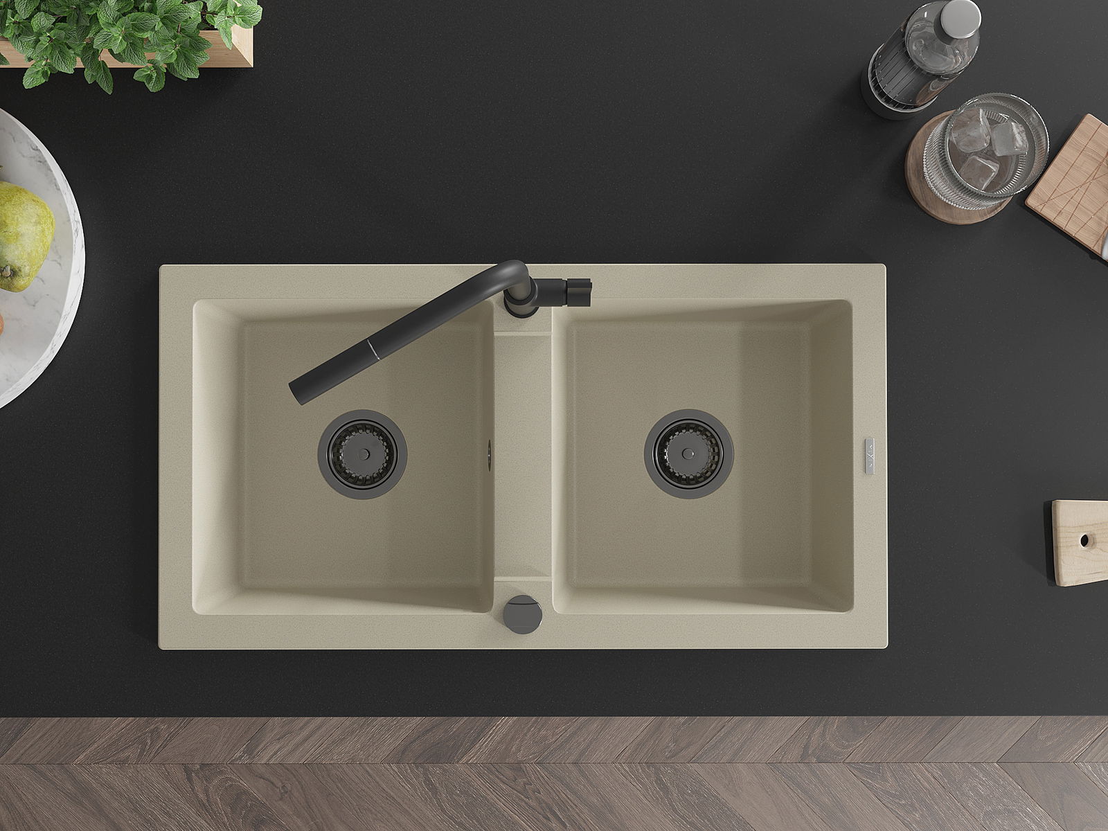 Mexen Mario gránit mosogató 2 rekeszes konyhai csappal Flora, bézs - 6504-69-670401-70-B