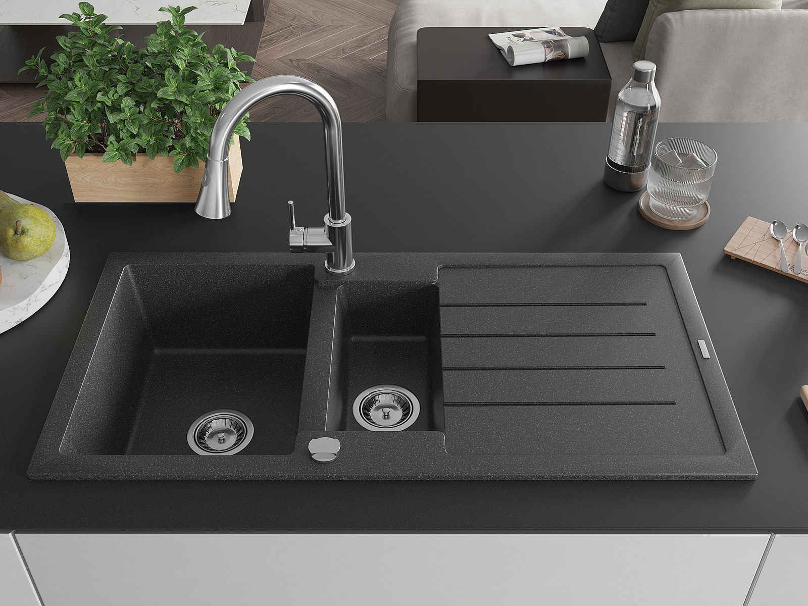 A mosogató 2 összekapcsolt lyukkal rendelkezik, amelynek átmérője 35 mm, önmagában. Felhasználhatók többek között Olyan folyékony adagoló rögzítéséhez, amely kiküszöböli a műanyag palackok jelenlétét a konyhában, és elegáns kivitelben adja meg.