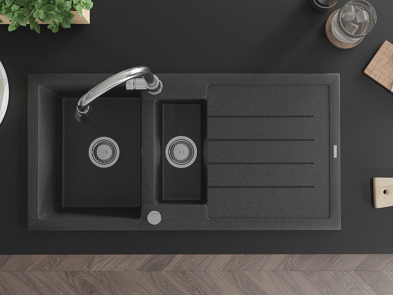 A mosogató kiváló minőségű gránitból készül. Ez egy elegáns és mindenekelőtt minden konyhához praktikus kiegészítés, stílusától függetlenül. A kiváló minőségű és a gránit tartósság biztosítja a sok éves használatát.