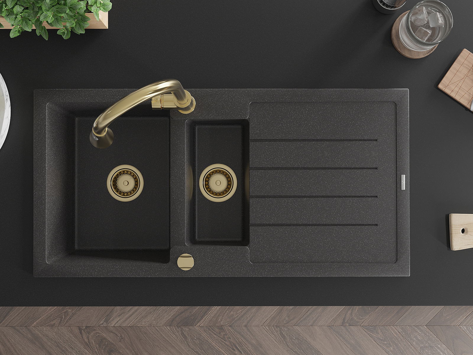 Mexen Andres 1,5-medencés, gránit mosogató csepegtetővel és Elia konyhai csapteleppel, fekete pettyes - 6515-76-670101-50